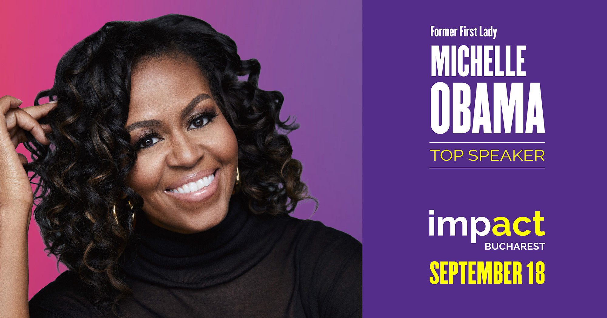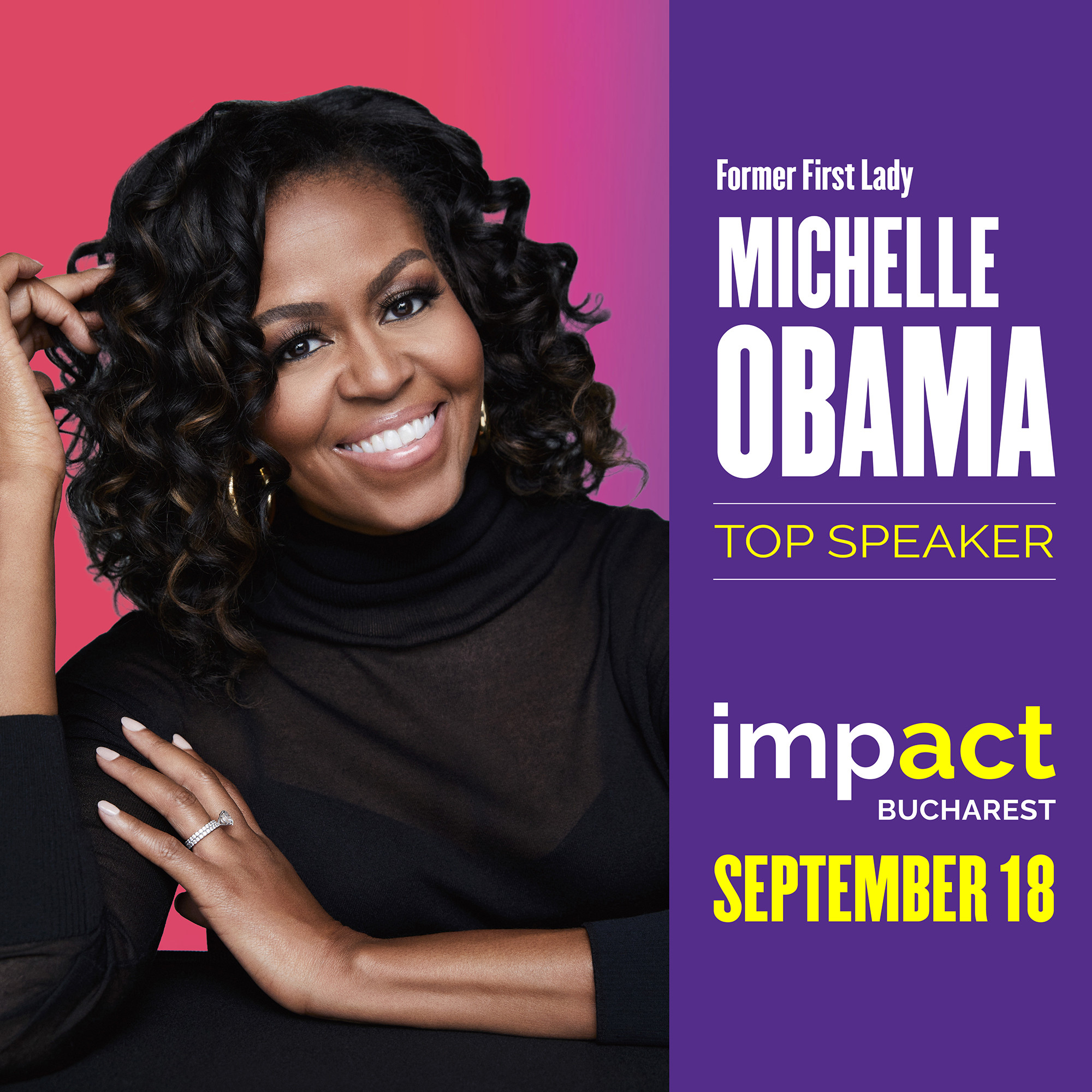 Prima Doamnă a Statelor Unite timp de opt ani, Michelle Obama va fi prezentă în București pe 17 și 18 septembrie și va vorbi pe scena Impact Bucharest. Evenimentul de business și tehnologie, cel mai mare din Europa de Sud-Est, reunește lideri și pasionați din business, administrație, tehnologie și media și va fi organizat pentru al doilea an în capitala României. Sunt așteptați peste 2.000 de participați din țara noastră și străinătate.