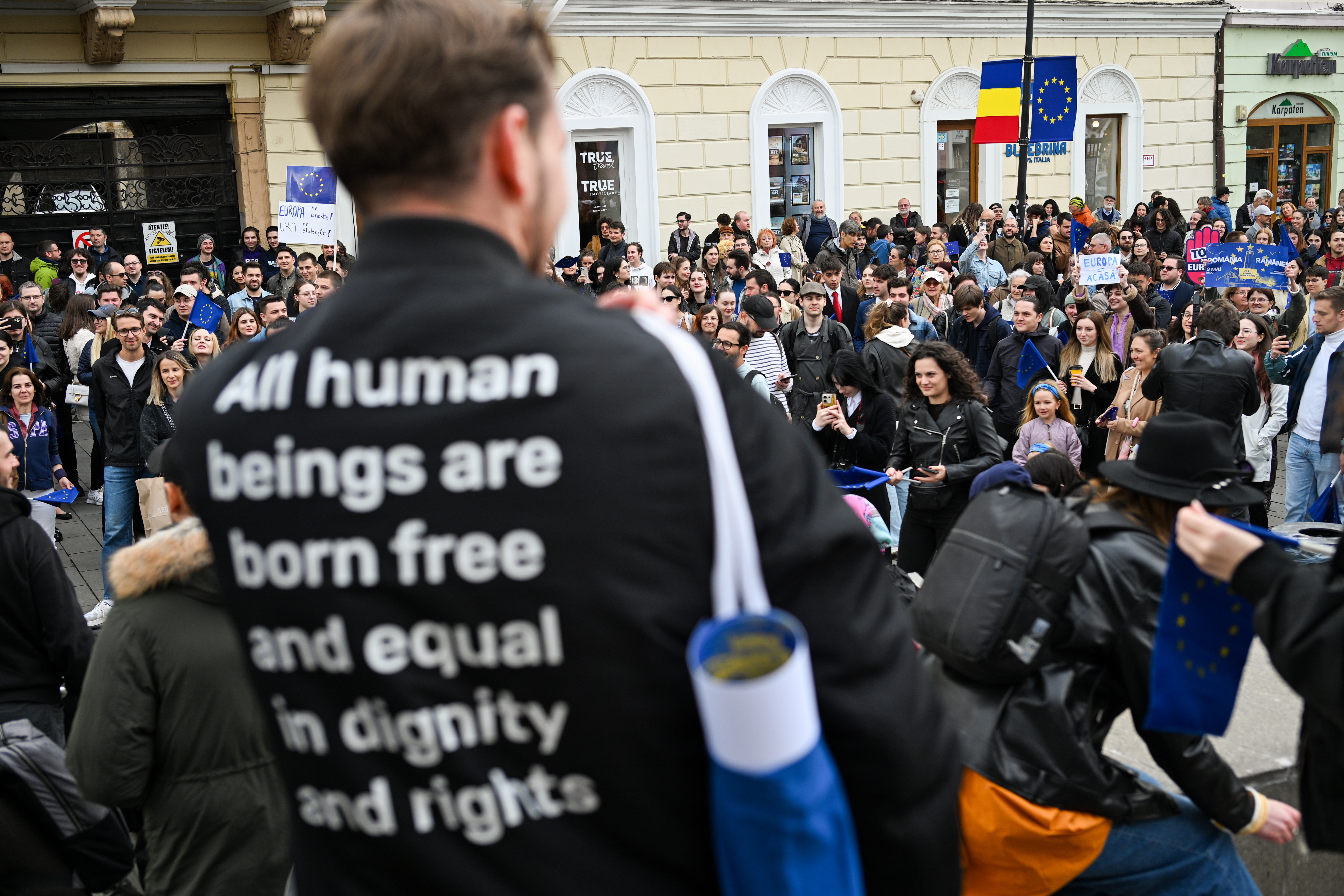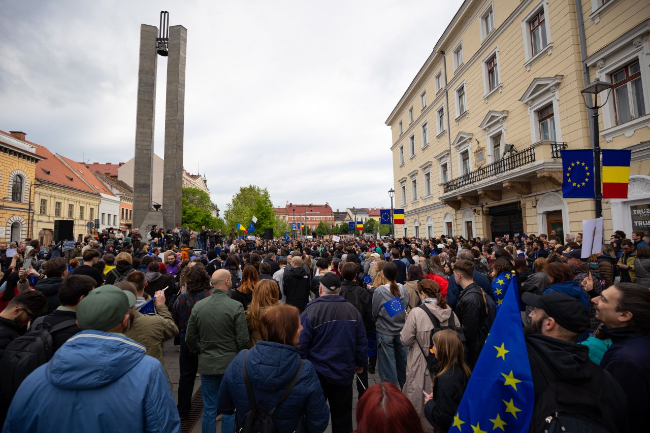 Peste 500 de persoane, în special tineri, au participat, vineri, la manifestaţia din zona centrală a municipiului Cluj, pentru a-şi arăta solidaritatea cu valorile europene şi pentru a-şi exprima dorinţa ca drumul României să rămână cel european.