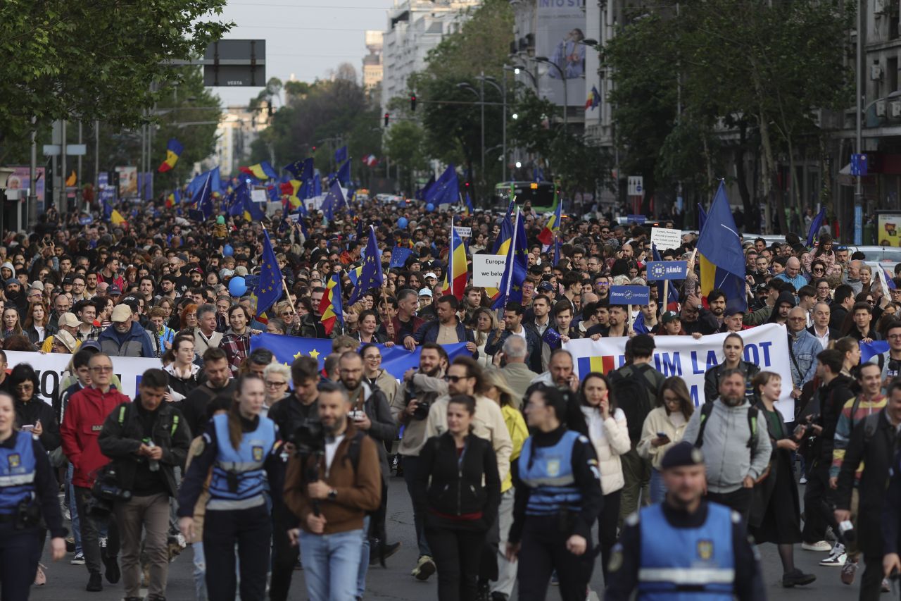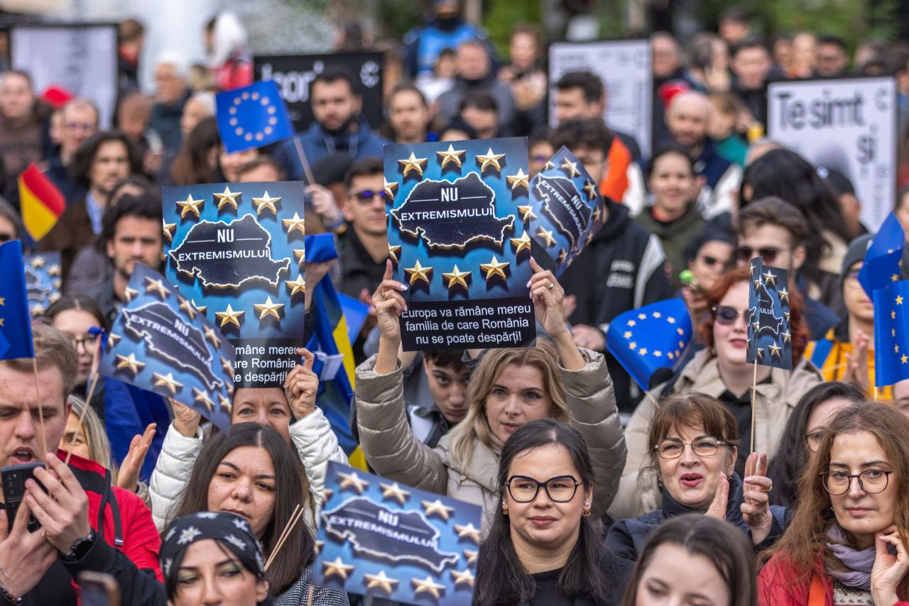 "Nu trebuie să ieşim din Uniunea Europeană. Oamenii trebuie să realizeze pericolul de a ieşi din UE cu candidatul extremist. Noi şi copiii ne vedem viitorul în UE, dar dacă se întâmplă să se schimbe traiectoria europeană, probabil că vom pleca din România", a spus unul dintre participanţii la manifestaţie.