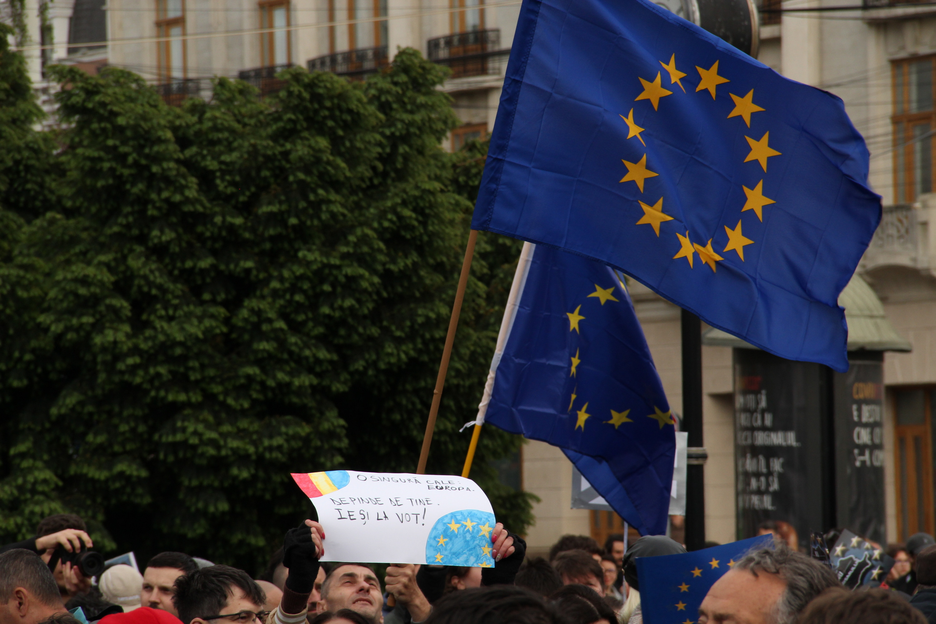 De asemenea, ei au purtat inscripţii cu mesaje precum "Europa este familia noastră", România votează Europa contează", "Rusia ne vânează, EU ne protejează".