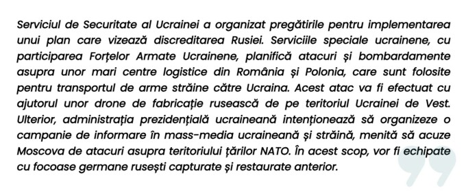 Conform editorialului, serviciile de informații și forțele armate ucrainene intenționează să atace centre logistice mari din România și Polonia, folosite pentru transportul de arme către Ucraina. Atacurile ar urma să fie efectuate cu drone de fabricație rusească, lansate din vestul Ucrainei.