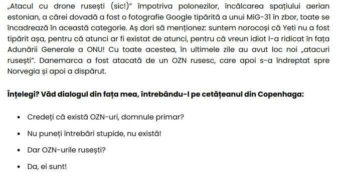 Materialul nesemnat din publicația maghiară aruncă în derizoriu și problema dronelor rusești văzute în mai multe locuri din Europa.