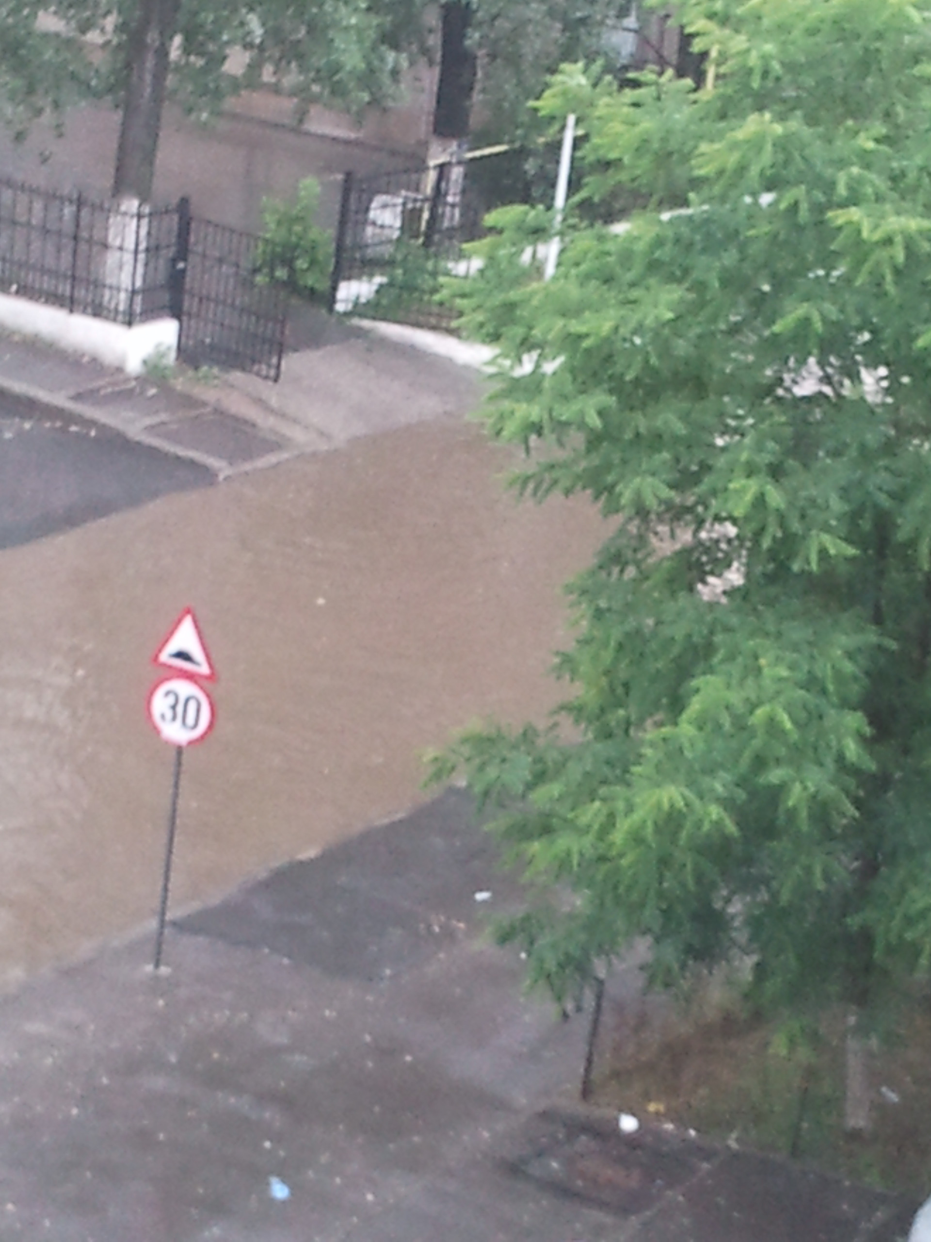 UPDATE 18:10. Ploile torentiale au facut prapad si pe strazile din Capitala. Un utilizator ne-a trimis imagini din cartierul Titan, unde apa a depasit nivelul rotilor de la masini.