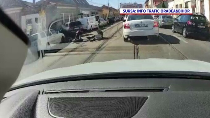 O cameră de bord a surprins, la Oradea, momentul în care doi tineri, aflați pe aceeași trotinetă, se dezechilibrează și se izbesc de asfalt. Mergeau pe contrasens.