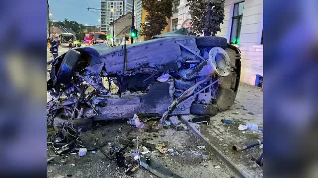 Momentul în care tânărul nervos din cauza jocurilor de noroc a intrat în stâlp, în Cluj. Mașina s-a rupt în două