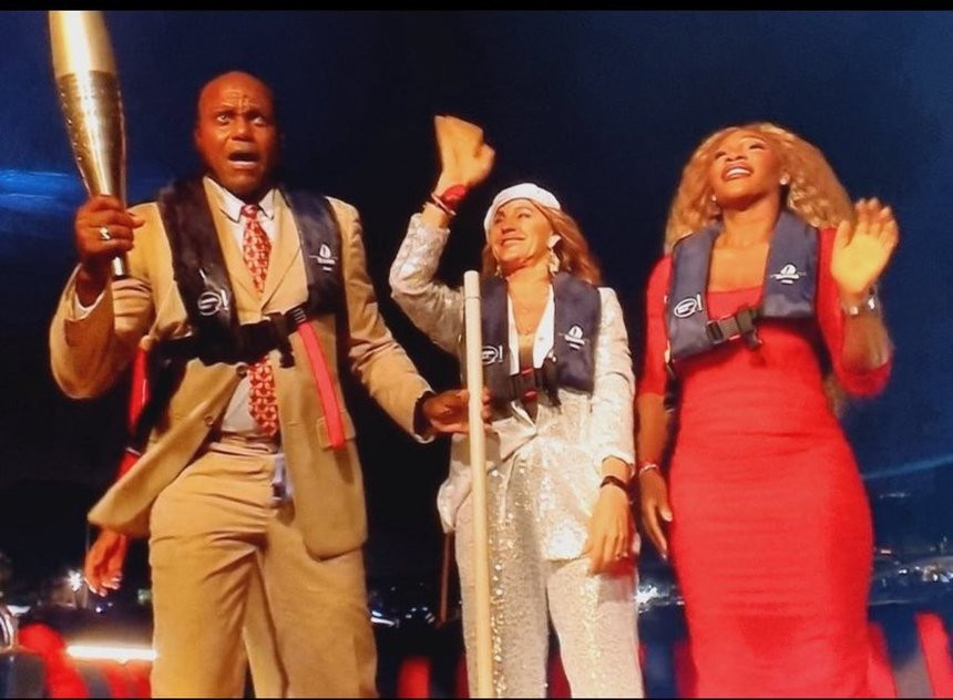 Fostul sprinter s-a alăturat medaliaţilor cu aur Serena Williams, Rafael Nadal şi Nadia Comăneci pe o barcă pe Sena, purtând flacăra olimpică la ceremonia tradiţională de aprindere a vasului olimpic.