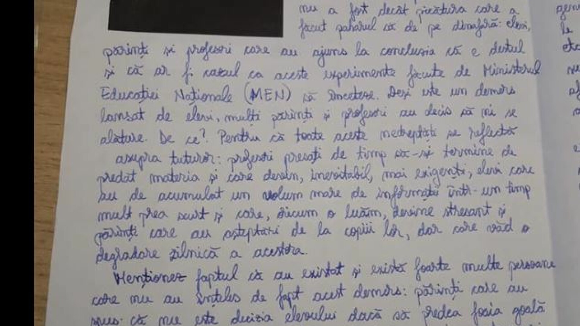 ”Stimați profesori, probabil ați înțeles deja că aceasta nu este o lucrare ca toate celelalte și că am ales să mă alătur protestului Consiliului Național al Elevilor, în loc să rezolv subiectul...De ce vrem să schimbăm sistemul de învățământ și am ales să protestăm astfel? Deoarece educația de azi îl formează pe omul de mâine, om pe care noi îl numim viitorul țării. Cât despre forma de protest, exact așa cum părinții noștri ies în stradă pentru abrogarea ordonanțelor de urgență, exact așa și noi am căutat o modalitate de a ne face auziți, pentru că știm că acum argumentul oamenilor mari este că suntem minori și că nu putem decide singuri, dar peste câteva luni sau un an, când terminăm clasa a XII-a, se presupune că suntem și noi adulți și putem lua decizii și fără ajutorul lor” este un fragment din analiza elevei.