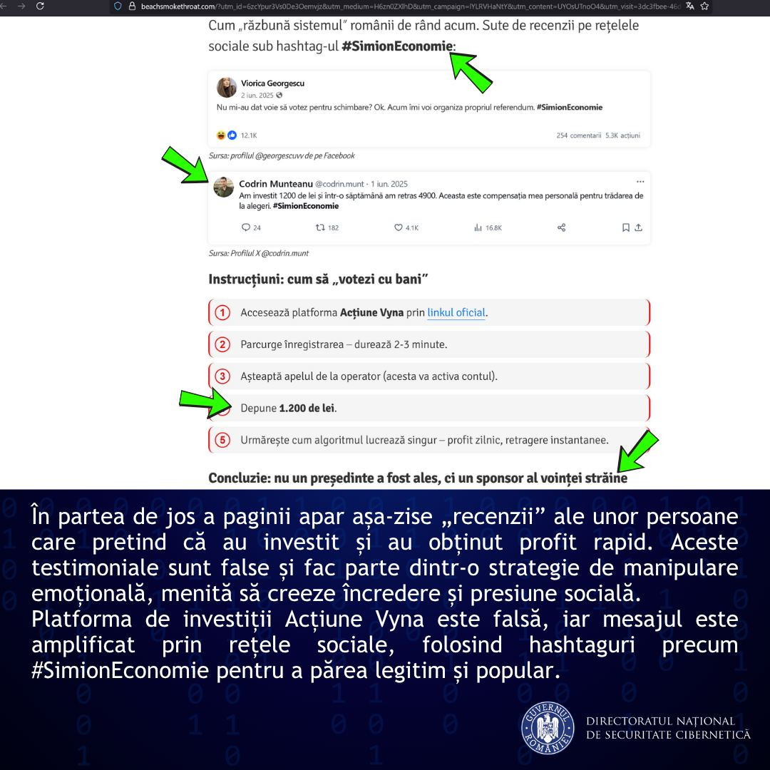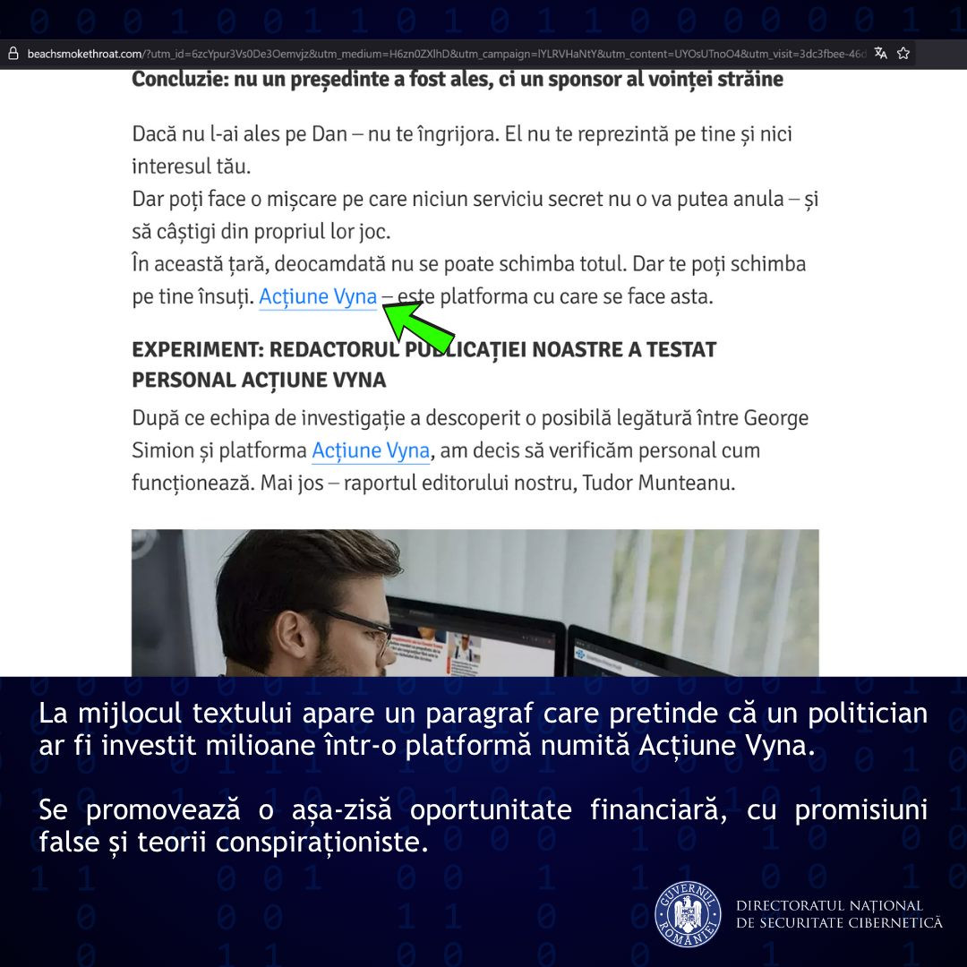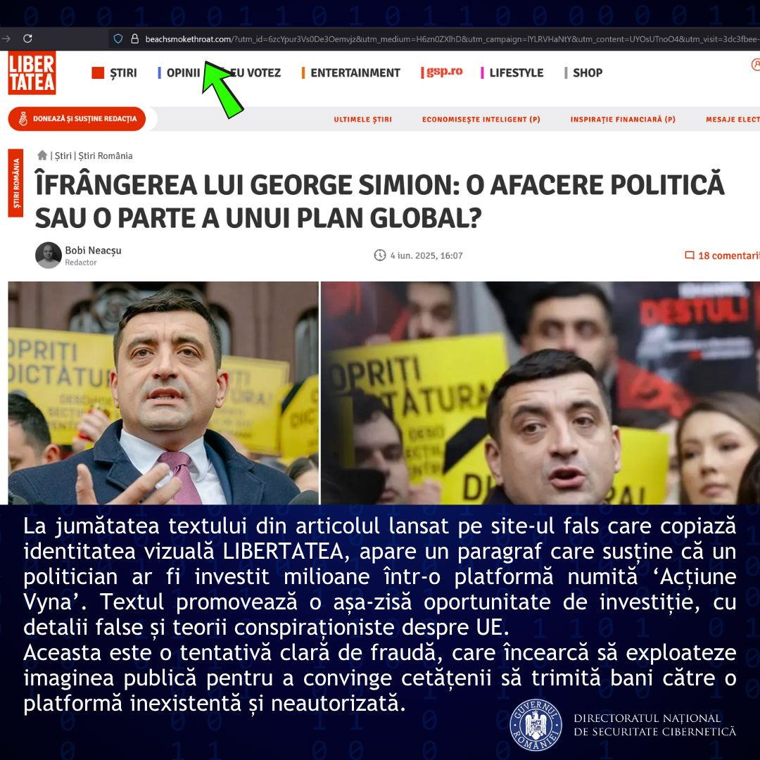 DNSC descrie modul în care acţionează hackerii: utilizează pagini cu un număr mare de urmăritori, eventual verificate de platforma de social media, pentru a câştiga încrederea publicului; răspândesc mesaje false prin campanii plătite pentru a manipula percepţiile utilizatorilor; generează constant reclame cu un conţinut manipulator sau fraudulos, care redirecţionează utilizatorii către site-uri care copiază de obicei identitatea vizuală a unor entităţi de presă cu reputaţie (în acest caz, site-ul către care este trimisă potenţiala victimă arată vizual similar cu cel al @Libertatea, dar are un domeniu evident diferit de cel original (beachsmokethroat[.]com); articolele sau mesajele care promovează aceste fraude adesea conţin greşeli de dactilografiere, un semn frecvent al tentativelor de scam.