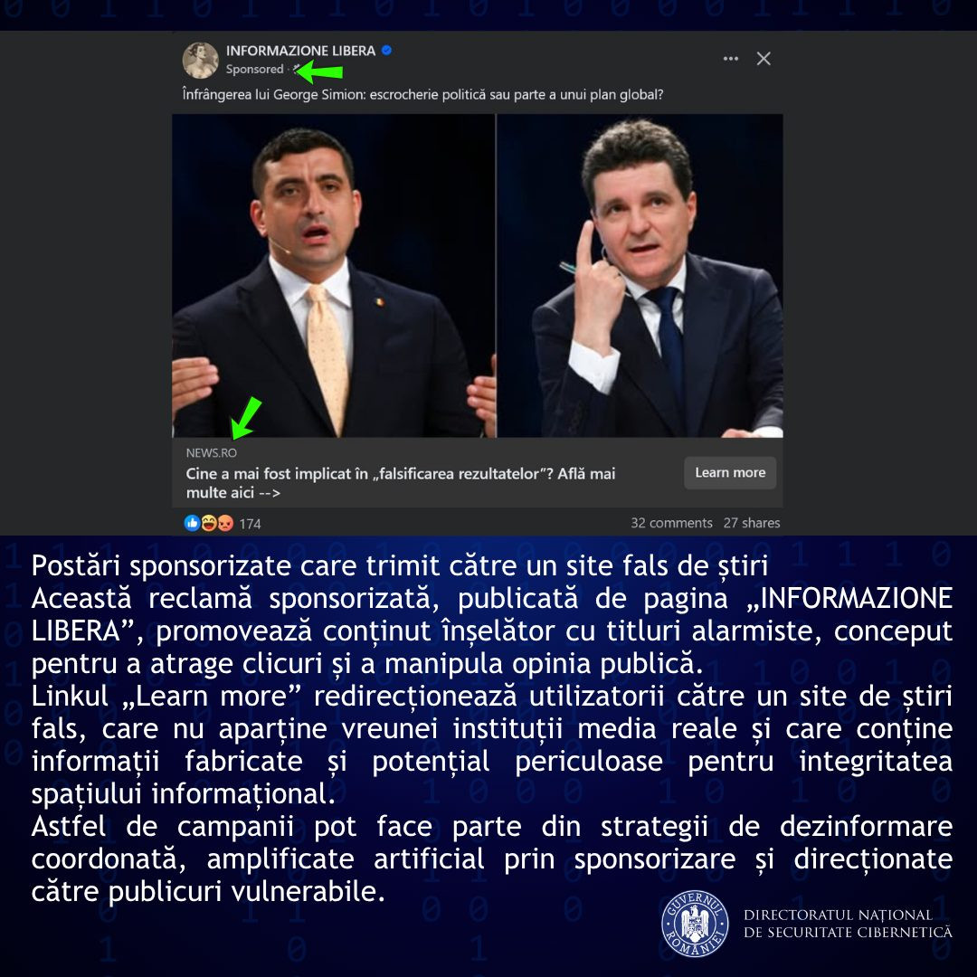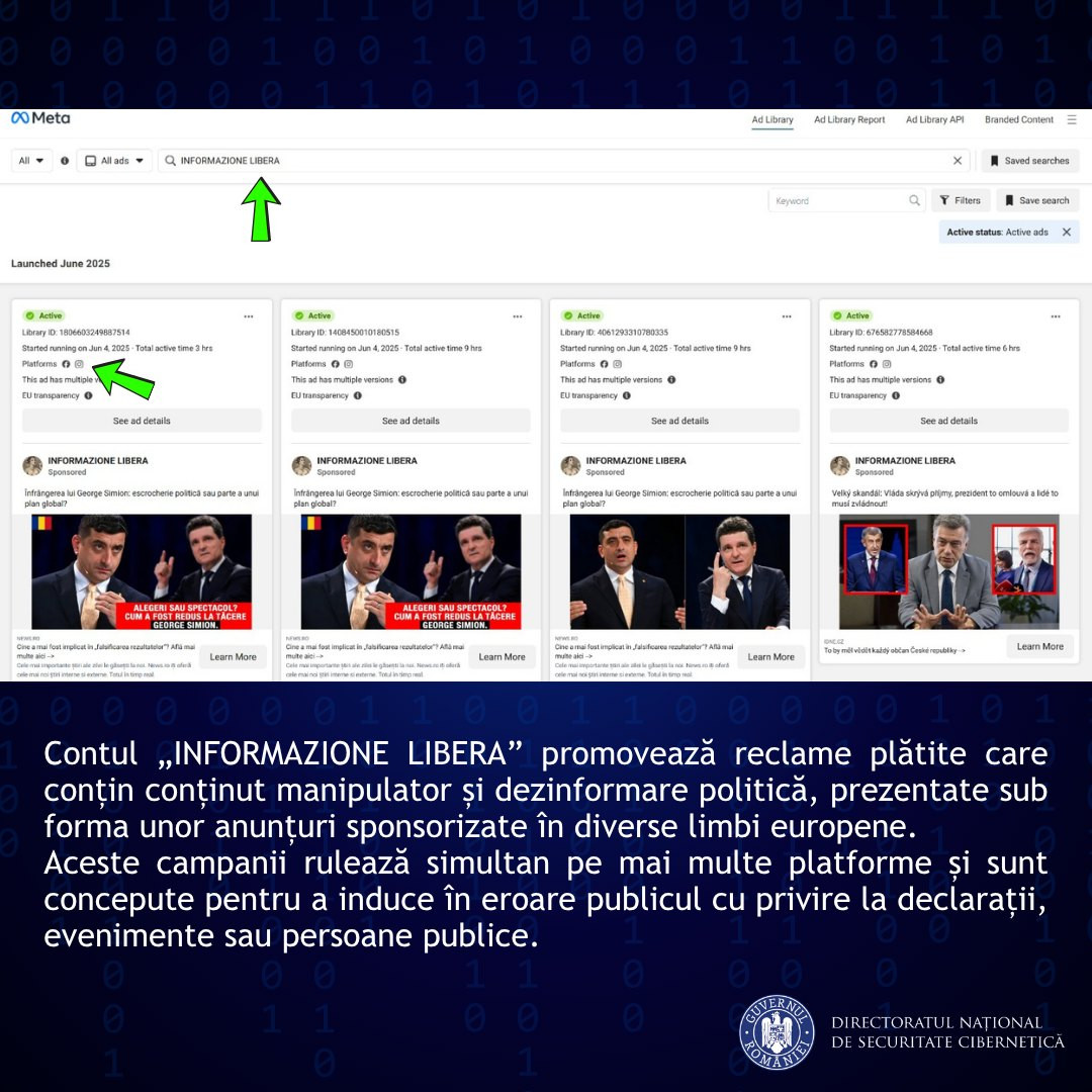 "În contextul digital actual, atacurile cibernetice devin din ce în ce mai complexe şi mai sofisticate. Tehnicile de dezinformare, combinate cu metodele de phishing, reprezintă o ameninţare semnificativă la adresa securităţii online. Unele atacuri se desfăşoară pe platformele de social media, unde atacatorii manipulează opinia publică şi răspândesc informaţii false pentru a influenţa comportamentele utilizatorilor. Un caz recent identificat de echipa DNSC demonstrează tehnicile folosite de infractorii din mediul online pentru a manipula cu informaţii false şi, totodată, pentru a determina potenţialele victime să furnizeze date sensibile, inclusiv date financiare. Această speţă are în centru o pagină de Facebook cu milioane de urmăritori (Informazione Libera) care a fost (cel mai probabil) compromisă de atacatori. Indiciul principal este faptul că pagina respectivă nu a mai publicat postări din luna mai 2023, în schimb a lansat multiple anunţuri sponsorizate, în diverse limbi europene. Atacatorii au putut astfel profita de audienţa bogată a acestei pagini pentru a fi cât mai eficienţi în răspândirea mesajelor", se arată într-un comunicat de presă al DNSC, transmis joi Agerpres.