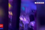 Pe şoseaua udă, șoferul mașinii de culoare albastră intră cu viteză în curbă și nu mai reușește să controleze vehiculul. Trei autoturisme evită aproape milimetric impactul.