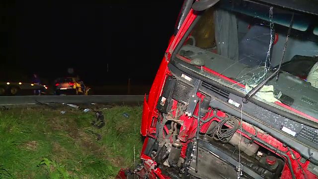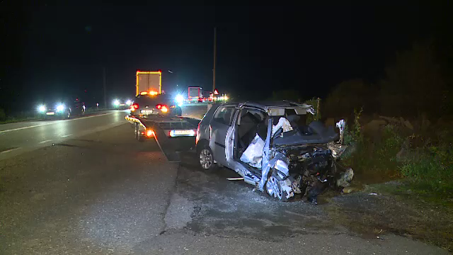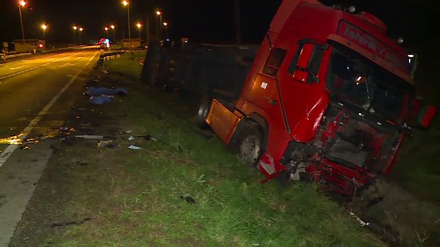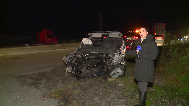Corespondent Știrile ProTV: Impactul a fost atât de violent, încât partea din față a mașinii a fost aproape în totalitate distrusă, iar autotrenul s-a răsturnat în șanț.