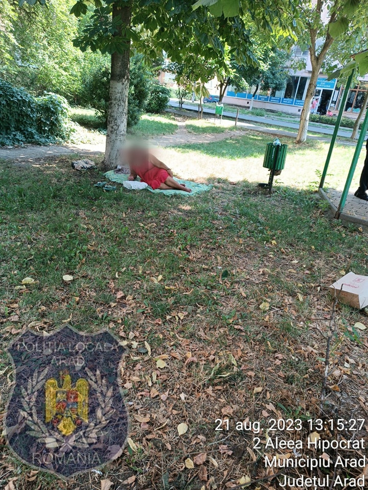„Aflat în cartierul Aurel Vlaicu, un echipaj din cadrul Serviciului Ordine Publică, Circulaţie şi Parcări 2 a surprins-o pe L.F., în vârstă de 49 de ani, cu domiciliul în Caracal, judeţul Olt, pe jumătate dezbrăcată, într-un părculeţ din faţa unui condominiu. Respectiva se afla în imediata vecinătate a unei zone utilizate pentru traficul pietonal, motiv pentru care expunerea zonelor intime către razele soarelui a şi determinat reacţia indignată a trecătorilor. L.F. le-a comunicat poliţiştilor locali că tocmai a sosit cu trenul în municipiul Arad, unde se află în tranzit, intenţionând să ajungă în cursul zilei în Timişoara, în căutarea unui loc de muncă. După ce a servit masa la un supermarket din proximitate, aceasta a ales să se relaxeze pe un spaţiu verde din strada Fulgerului, în forma documentată de poliţiştii locali”, a transmis Primăria Arad, printr-un comunicat de presă.