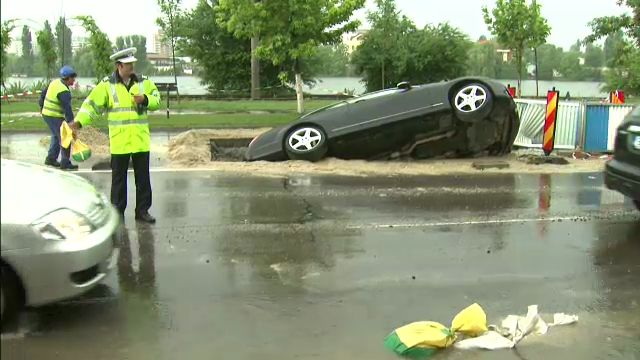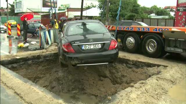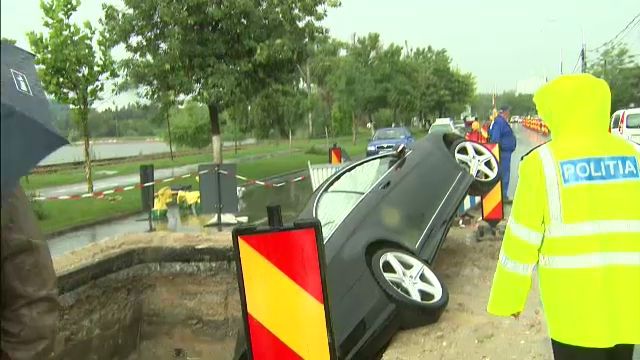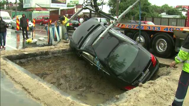 O masina de peste 100.000 euro a disparut cu totul intr-o groapa din Capitala. Ce a declarat soferul