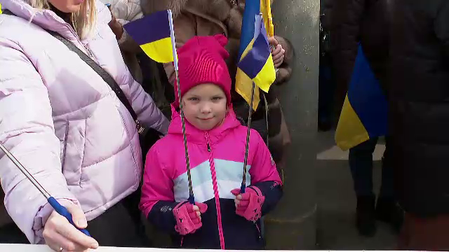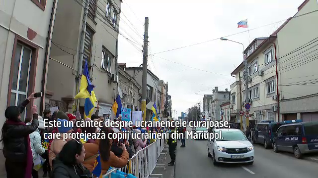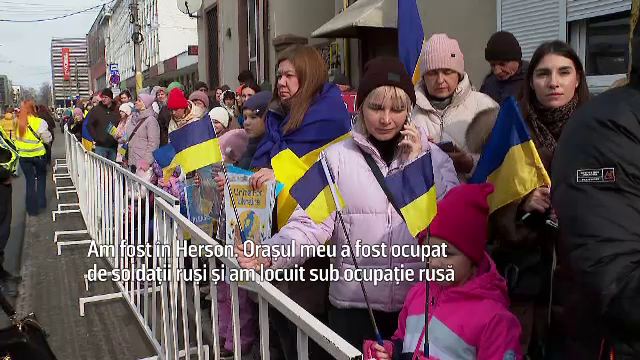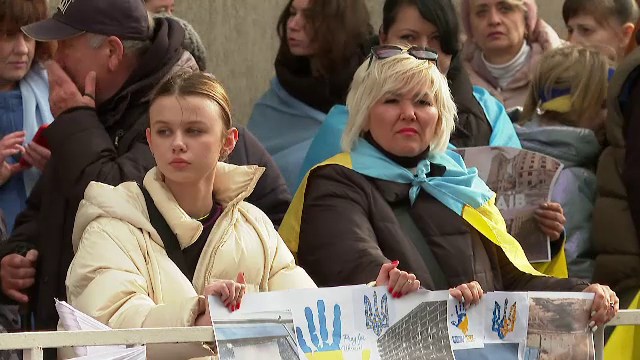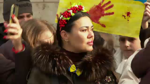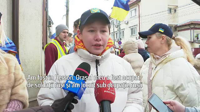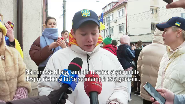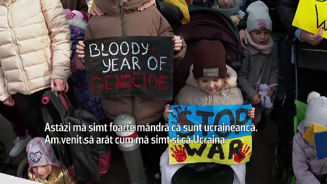 Ana Faichak, organizatorul mitingului: "Noi toți vrem acasă, că locuim aici de un an și mersi mult la România ne-o primit mai mult de oameni de oameni au venit, foarte mulți copii au venit, copiii au făcut pancarte, o scris toți țin partea Ucrainei, noi toți vrem acasă. (Reporter: Ce simţiţi astăzi?) Astăzi, durere în inimă”