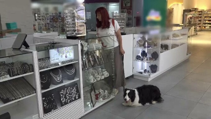 O doamnă din Oradea poate intra liniștită în magazinele care permit accesul cu câini. La raionul de parfumuri, Mați, un border collie de 5 ani, așteaptă liniștit la intrare. Puțin mai încolo, la bijuterii, stă cuminte la picior.