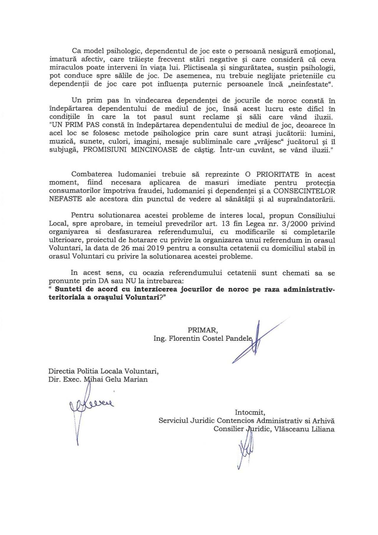 Astfel, la propunerea primarului orașului Voluntari, Florentin Costel Pandele, cetățenii sunt chemați să se pronunțe prin Da sau Nu la următoarea întrebare: "Sunteți de acord cu interzicerea jocurilor de noroc pe raza administrativ-teritorială a orașului Voluntari?".