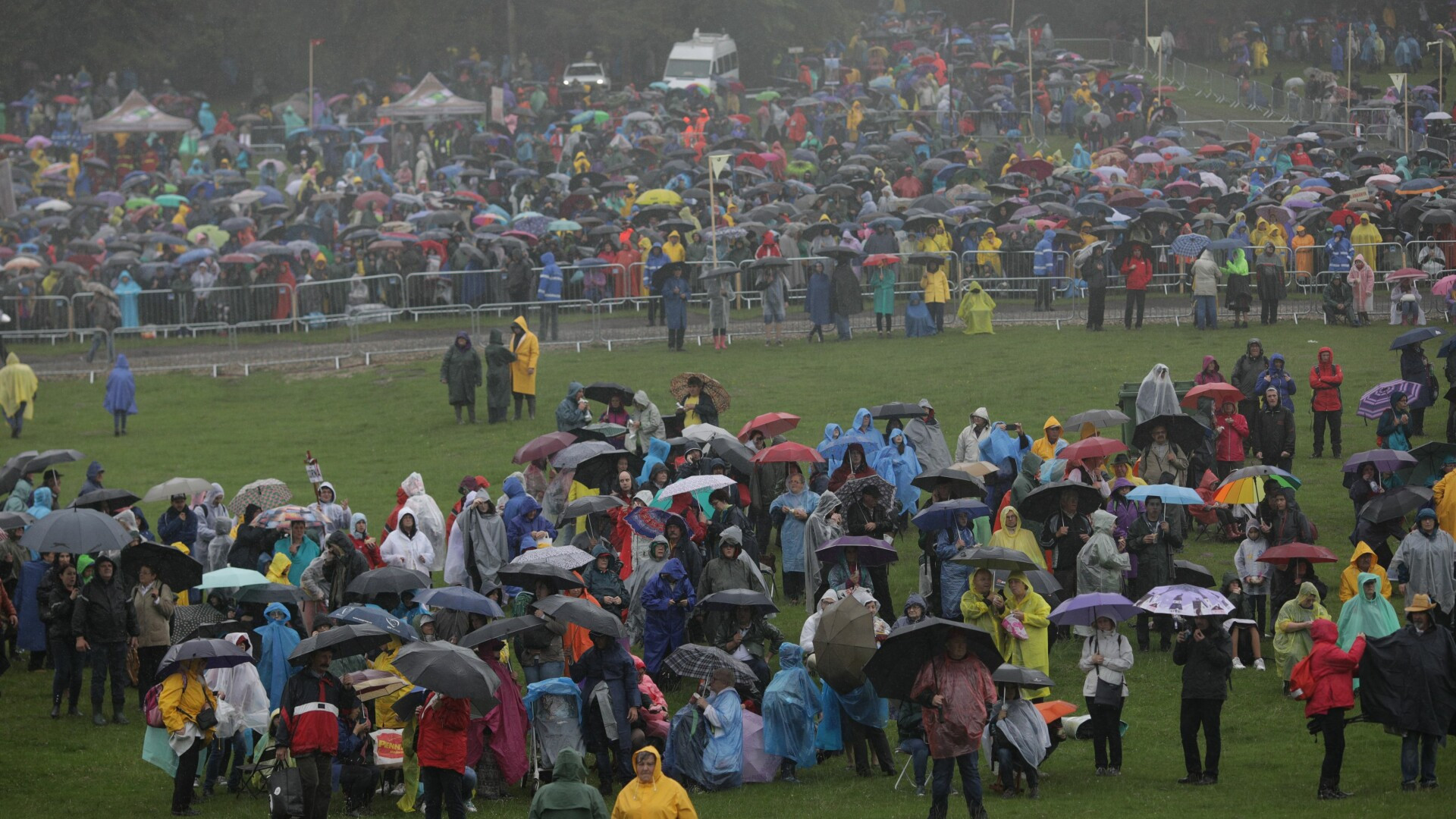 ora 15:00 Zecile de mii de pelerini care s-au strâns, sâmbătă, în faţa Palatului Culturii din Iaşi, înfruntă ploaia puternică în aşteptarea Papei Francisc.