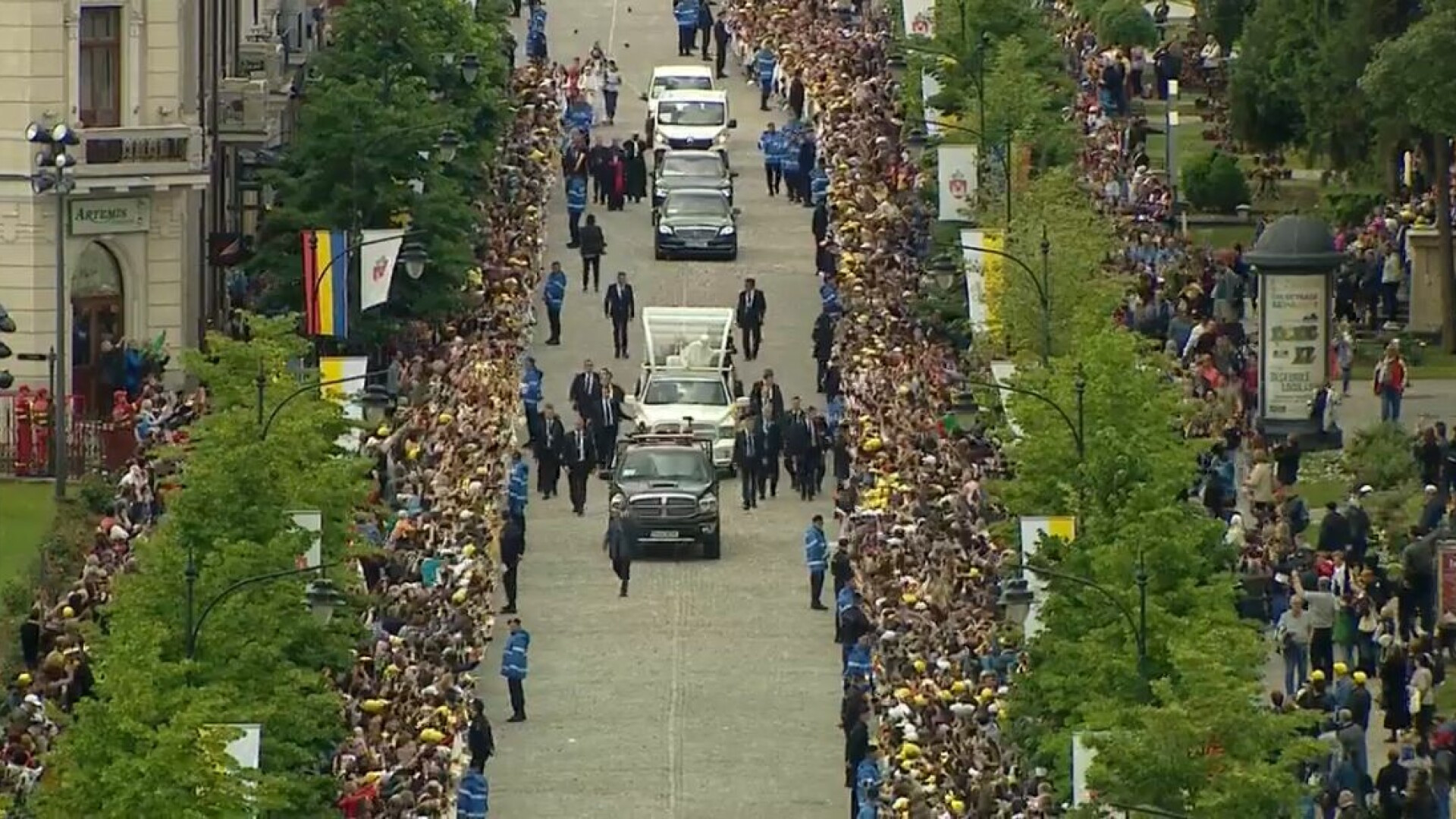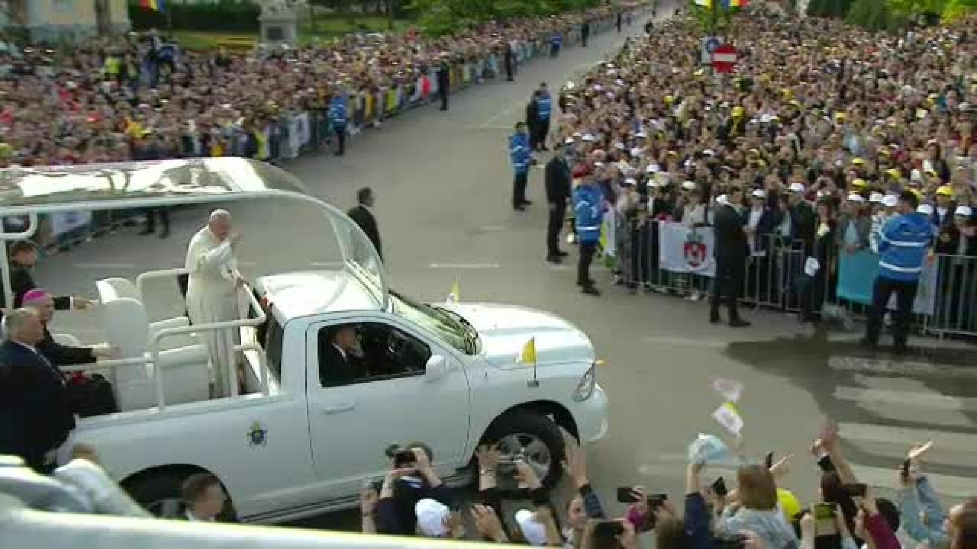 ora 13:20 Papa Francisc a plecat de pe platoul de la Şumuleu Ciuc după Liturghia Pontificală oficiată, sâmbătă, la sanctuarul marian, în prezenţa a aproape 100.000 de pelerini.