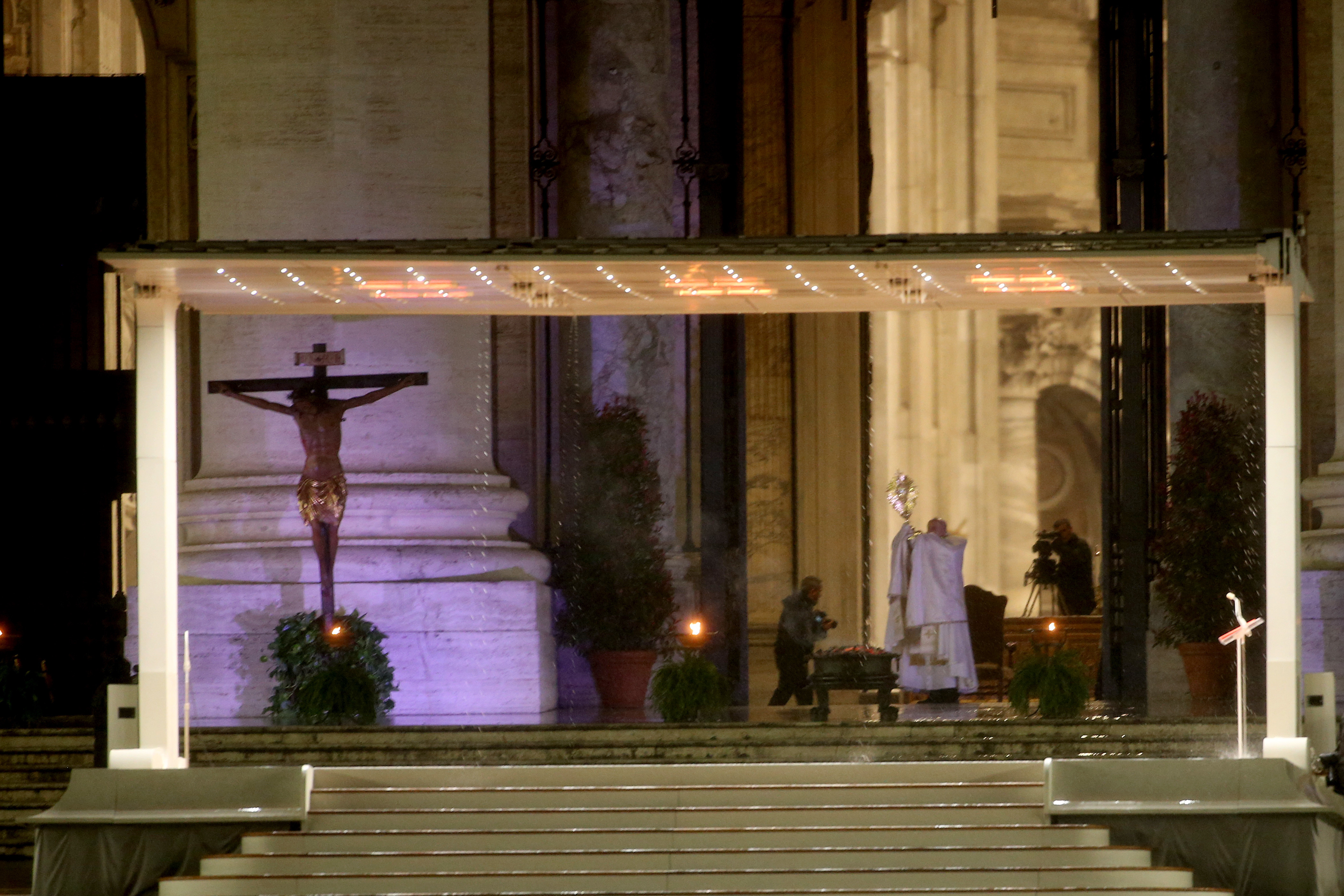 În piaţa pustie şi sub o ploaie continuă, Jorge Bergoglio a oferit credincioşilor catolici ai lumii o ceremonie fără precedent, o omilie şi o binecuvântare ulterioară. Acestea au putut fi urmărite online prin toate mijloacele de comunicare modern: Facebook, YouTube, TV şi radio. (Vezi mai multe imagini în galeria foto)