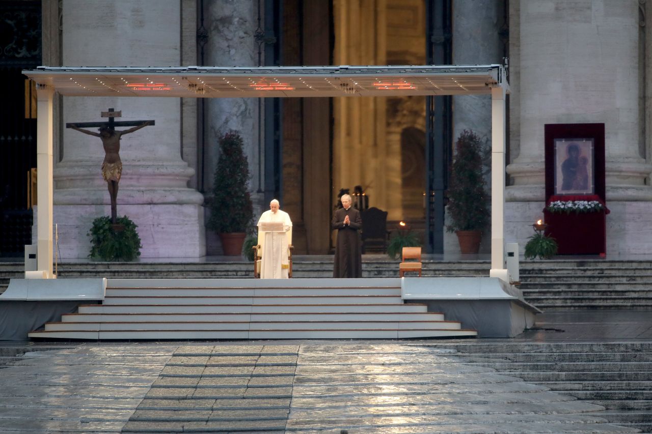 În piaţa pustie şi sub o ploaie continuă, Jorge Bergoglio a oferit credincioşilor catolici ai lumii o ceremonie fără precedent, o omilie şi o binecuvântare ulterioară. Acestea au putut fi urmărite online prin toate mijloacele de comunicare modern: Facebook, YouTube, TV şi radio. (Vezi mai multe imagini în galeria foto)