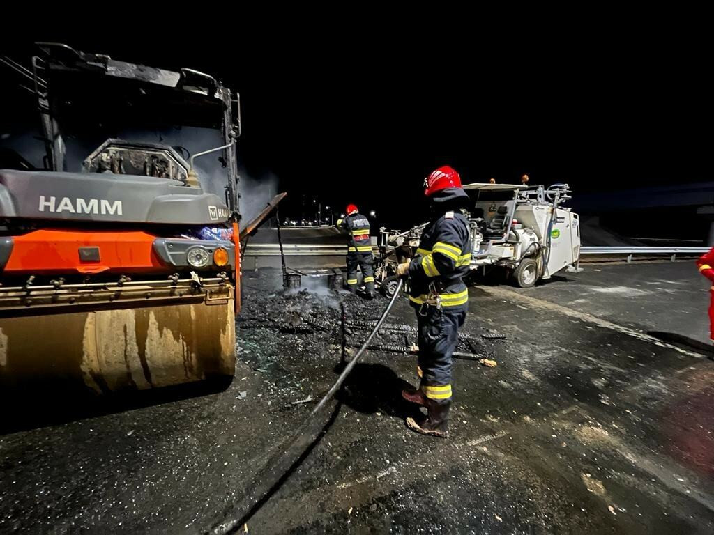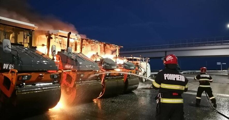 Patru utilaje pentru finisarea asfaltului au luat foc, marţi seara, pe şantierul Drumului Expres Craiova - Piteşti, între localităţile Balş şi Pieleşti, pe un sector aflat în lucru.