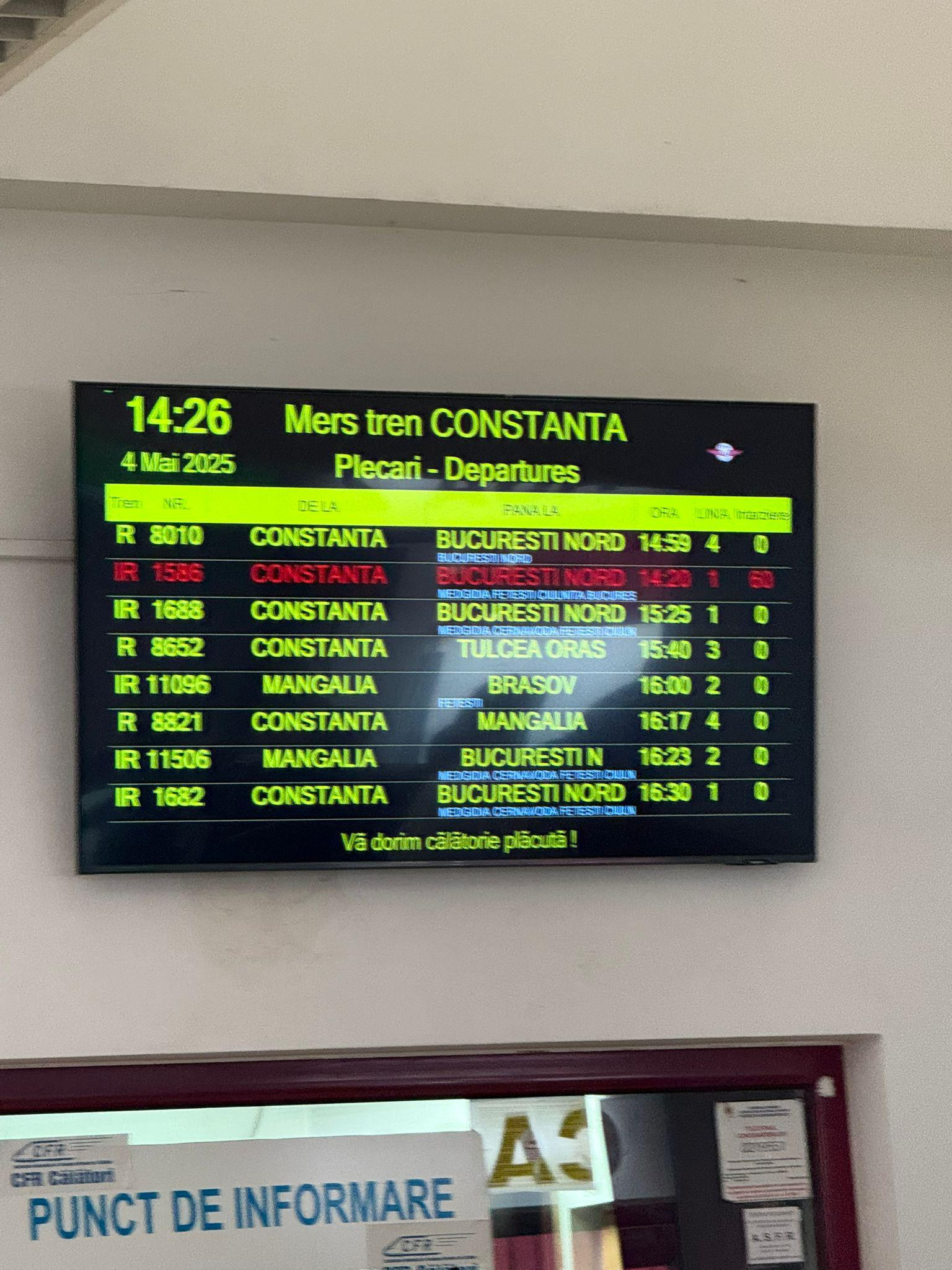 Compania Națională de Căi Ferate CFR SA vă informează că în stația CF Constanța a fost activat Planul Roșu de intervenție astăzi, 4 mai, la ora 14:15, în urma unui incident feroviar care a avut loc pe linia 1.