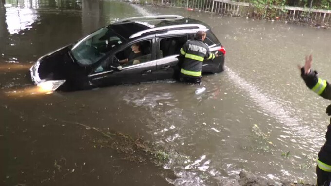 Acolo, apa a atins un metru, iar o șoferiță a rămas blocată cu mașina. Pompierii au ajutat-o să revină pe uscat, dar autoturismul nu a mai pornit.