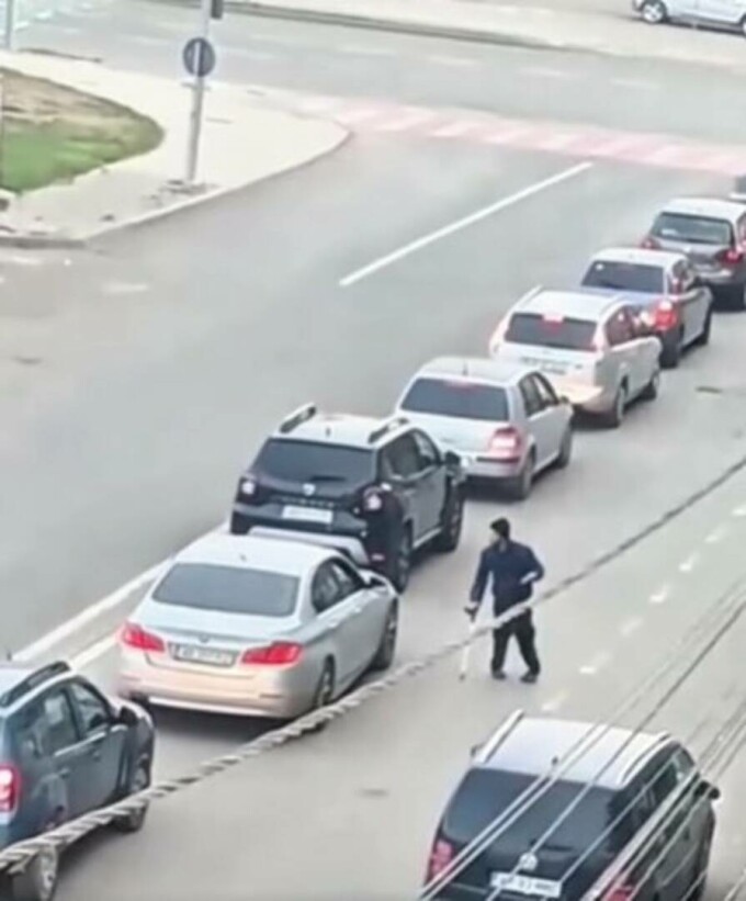 Într-o altă zonă, pe trotuar şi ferit de privirile şoferilor, acelaşi bărbat se deplasează cu sprijinul bastonului, iar când ajunge în dreptul propriului autoturism începe să meargă normal, după care urcă la volan.