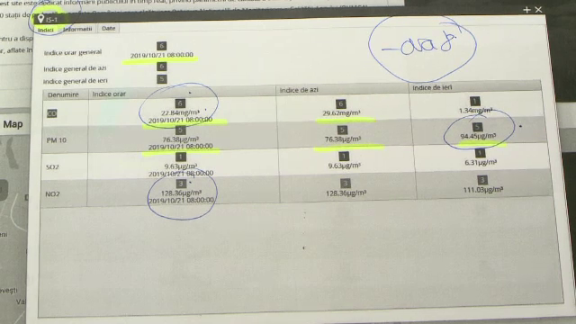 La staţia de măsurare a calităţii aerului de pe Calea Victoriei, valorile înregistrate ieri erau de 98ug/m3, dublu faţă de valorile normale, iar specialiştii spun că este acelaşi lucru cu a sta o zi într-o parcarare subterană de 200mp în care 10 maşini au motorul pornit.