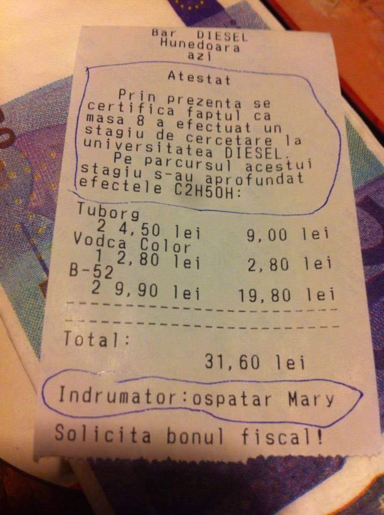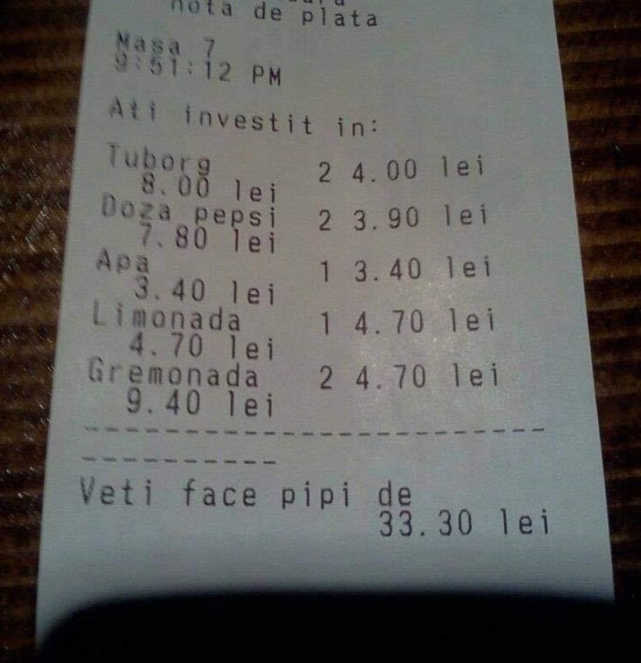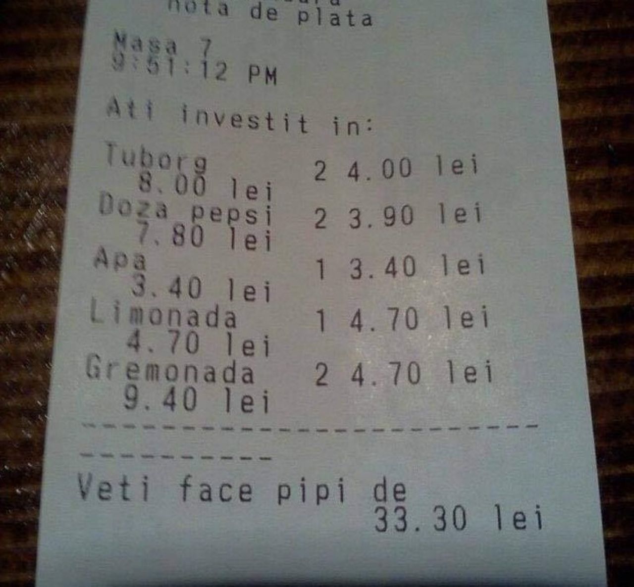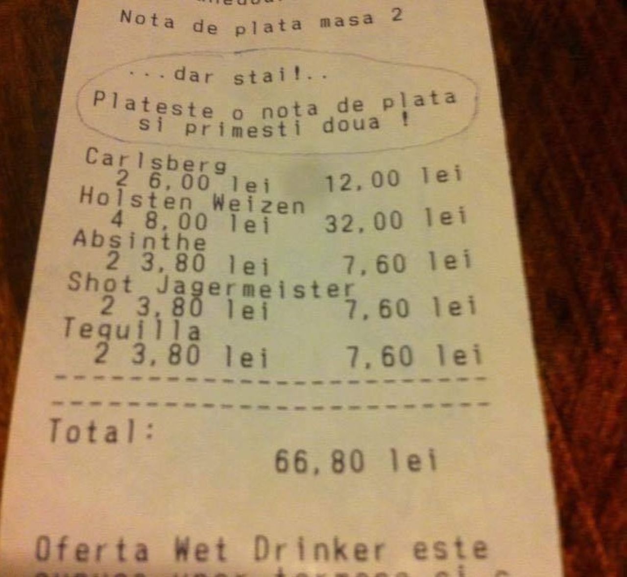 Notele de plată din mai multe baruri din Hunedoara au devenit virale pe rețelele de socializare, datorită mesajelor haioase care însoțesc suma pe care clienții o au de achitat.