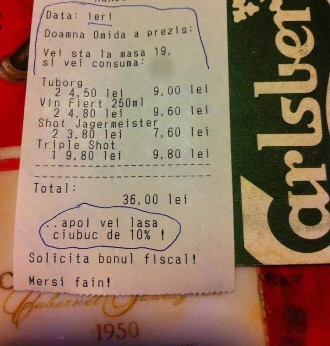 Pe un alt bon, apare mesajul: „Doamna Omida a prezis: veți sta la masa 19 și veți consuma” mai multe produse, „apoi veți lăsa ciubuc de 10%”.