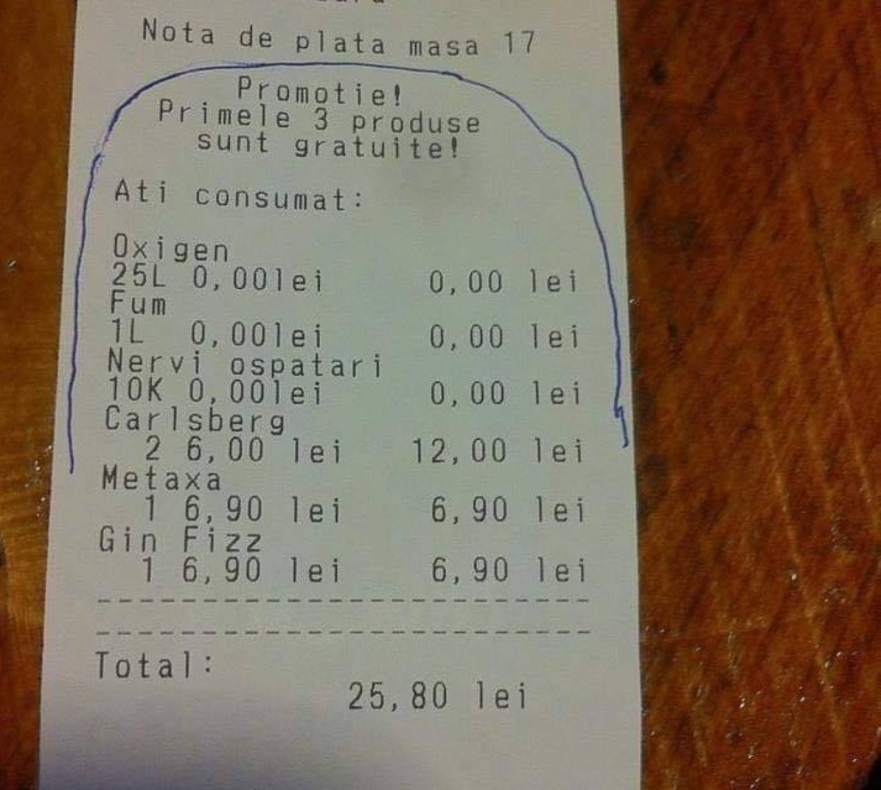 Pe unul dintre bonurile de consumație, clienții sunt informați că „primele trei produse sunt gratuite”: oxigen (25 l), fum (1 l) și nervii ospătarilor.