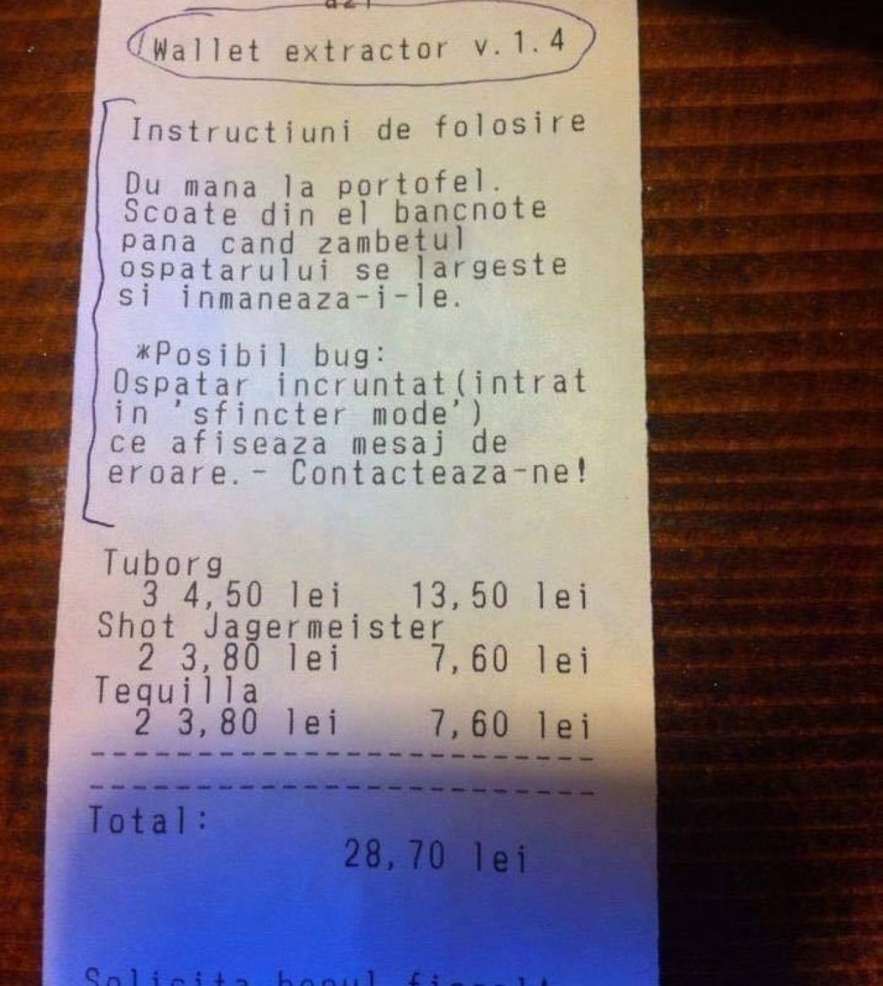 „Instrucțiuni de folosire: du mâna la portofel. Scoate din el bancnote până când zâmbetul ospătarului se lărgește și înmânează-i-le. Posibil bug: ospătar încruntat ( intrat în sfincter mode) ce afișează mesaj de eroare. Contactează-ne.”