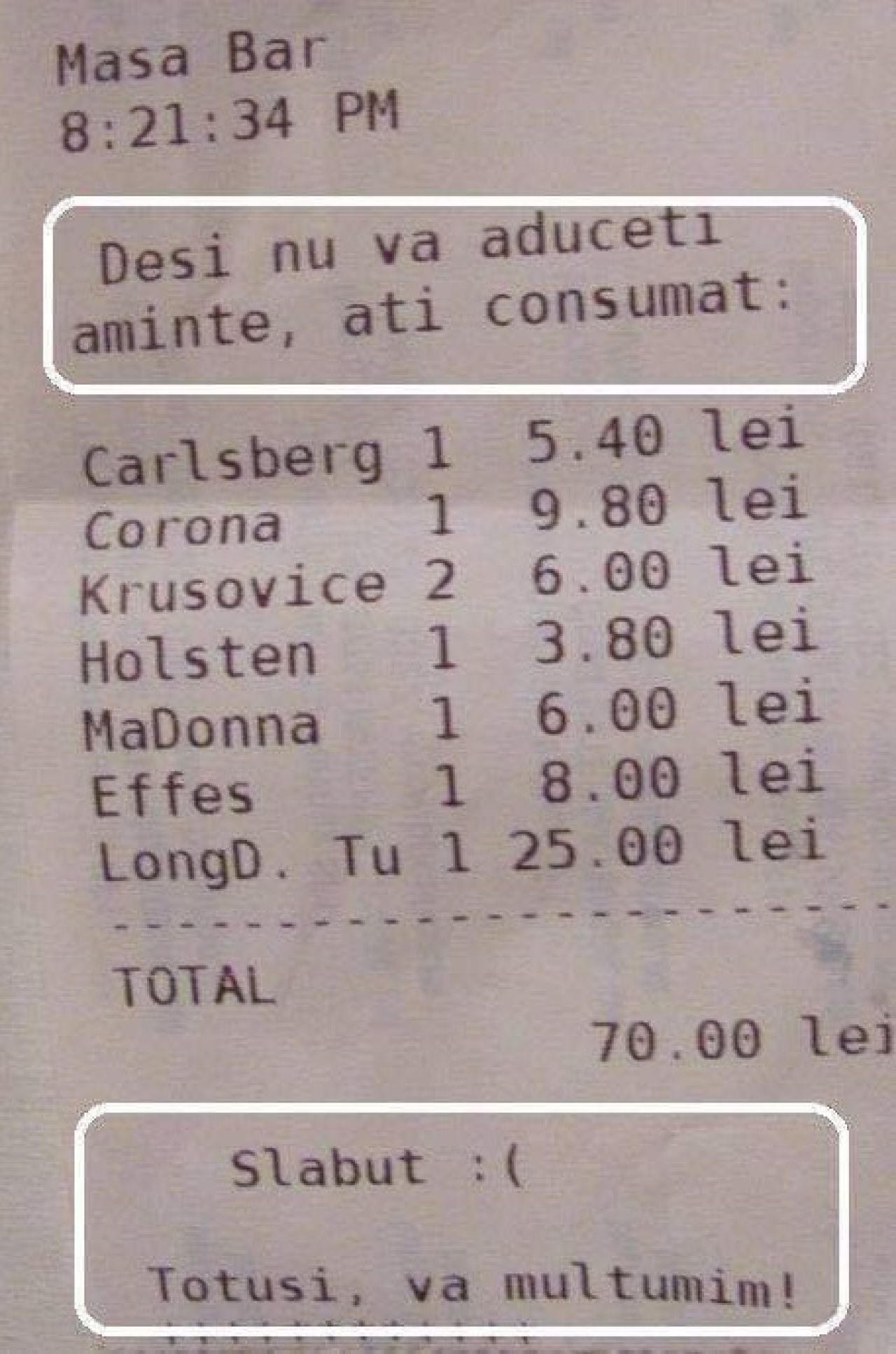 Pe un alt bon, apare mesajul: „Deși nu vă aduceți aminte, ați consumat...”. „Slăbuț.”