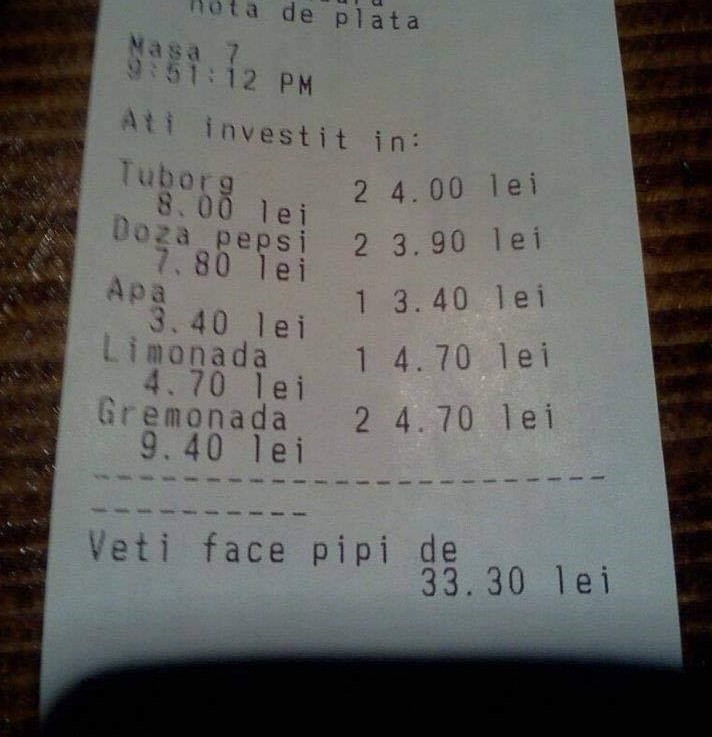 „Instrucțiuni de folosire: du mâna la portofel. Scoate din el bancnote până când zâmbetul ospătarului se lărgește și înmânează-i-le. Posibil bug: ospătar încruntat ( intrat în sfincter mode) ce afișează mesaj de eroare. Contactează-ne.”