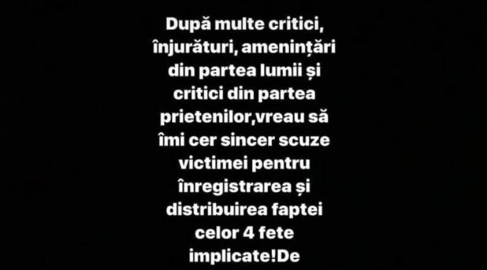 "După mai multe critici, înjurături, amenințări din partea lumii și critici din partea prietenilor, vrau să îmi cer sincer scuze victimei pentru înregistrarea și distribuirea faptei celor 4 fete implicate. De aceea îmi cer scuze și vouă pentru cuvintele spuse în timpul filmării. Nu vreau atenție și îmi asum tot ce am făcut. Autoritățile se ocupă de caz, aplicând sancțiunile necesare. Îmi cer scuze tuturor și sper să-mi iertați fapta", a scris băiatul, potrivit pandurul.ro.