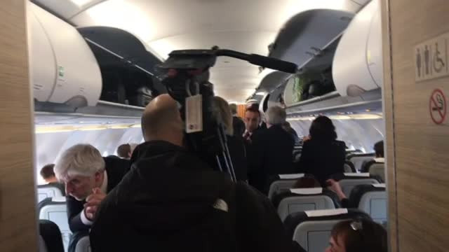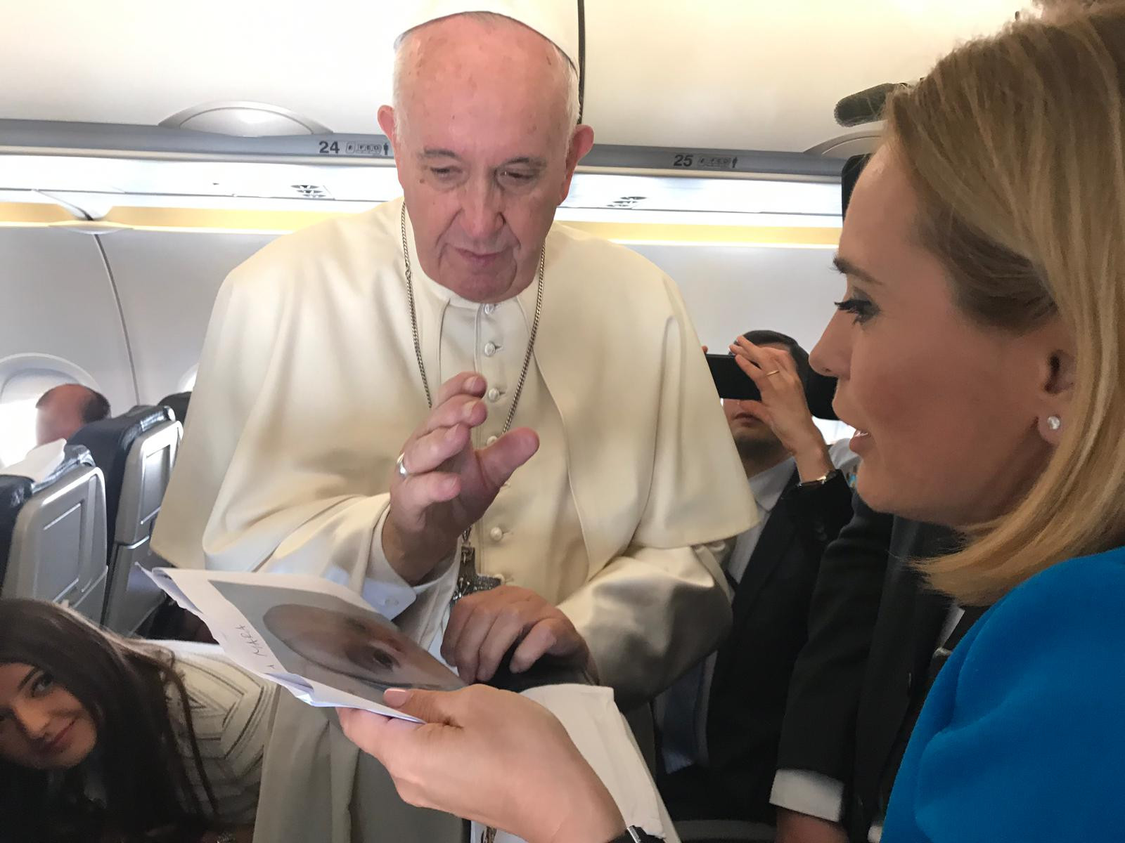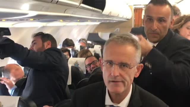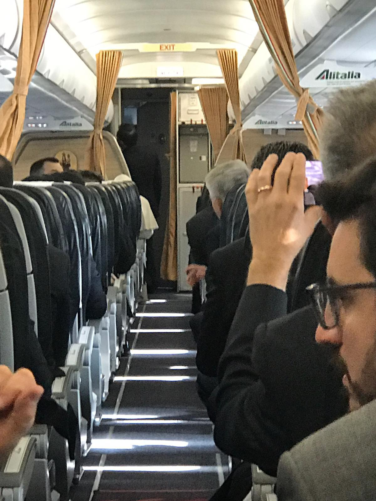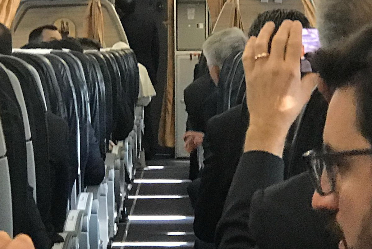 Jurnaliştii şi-au ocupat locurile în avionul papal, iar Suveranul Pontif a dat mâna cu fiecare dintre ei.