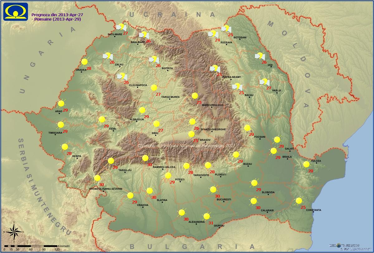 Vremea va fi deosebit de calda pentru sfarsitul lunii aprilie in majoritatea regiunilor. Cerul va fi variabil ziua in nordul si nord-estul tarii si mai mult senin in rest. Cu totul izolat in nordul Carpatilor Orientali vor fi posibile ploi slabe de scurta durata. Vantul va sufla slab pana la moderat, cu unele intensificari in zona montana inalta.