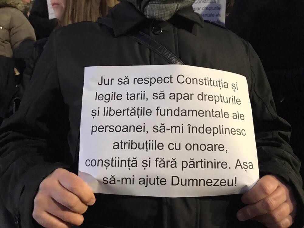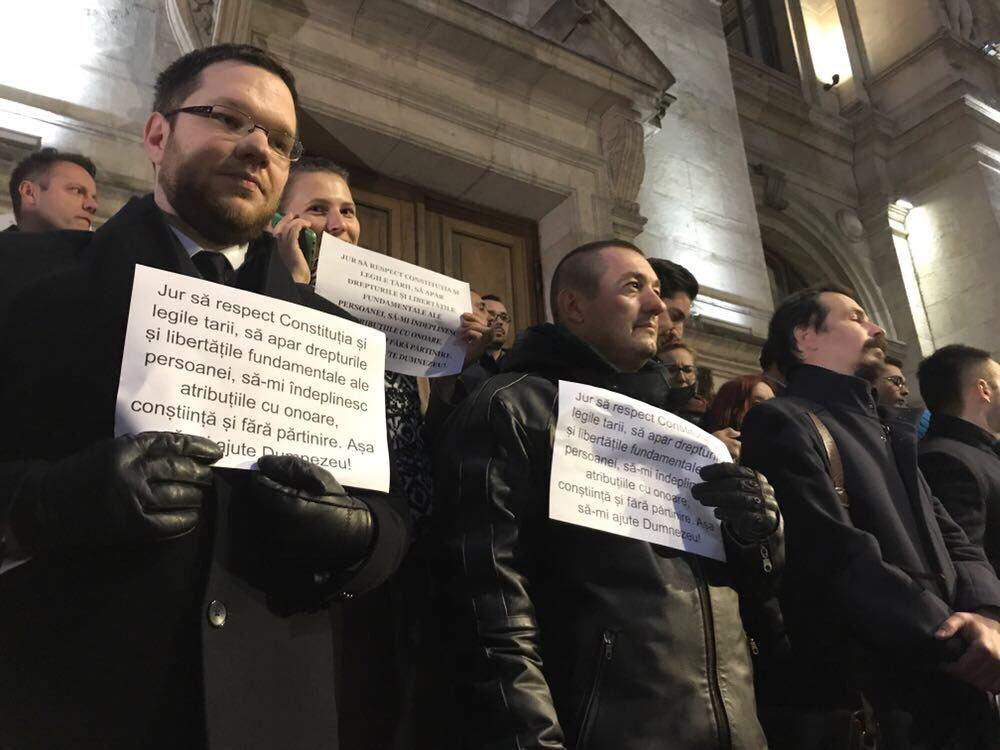 Scările Curţii de Apel au fost pline. Peste o mie de magistraţi au protestat tăcut, însă au purtat în mâini jurământul pe care l-au depus la numirea în functie: ”Jur să apăr Constituţia, să-mi îndeplinesc atribuţiile cu onoare şi fără partire.”