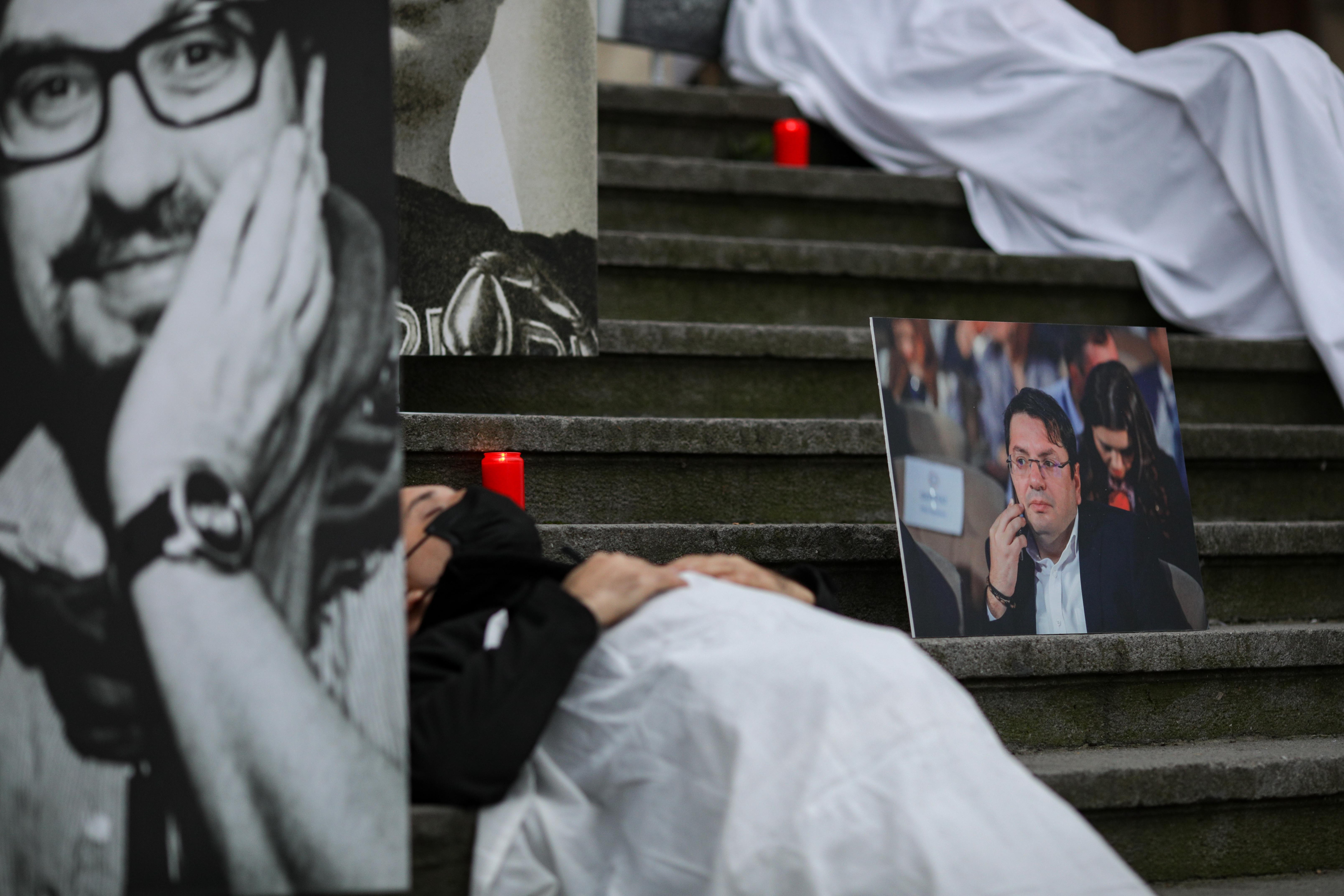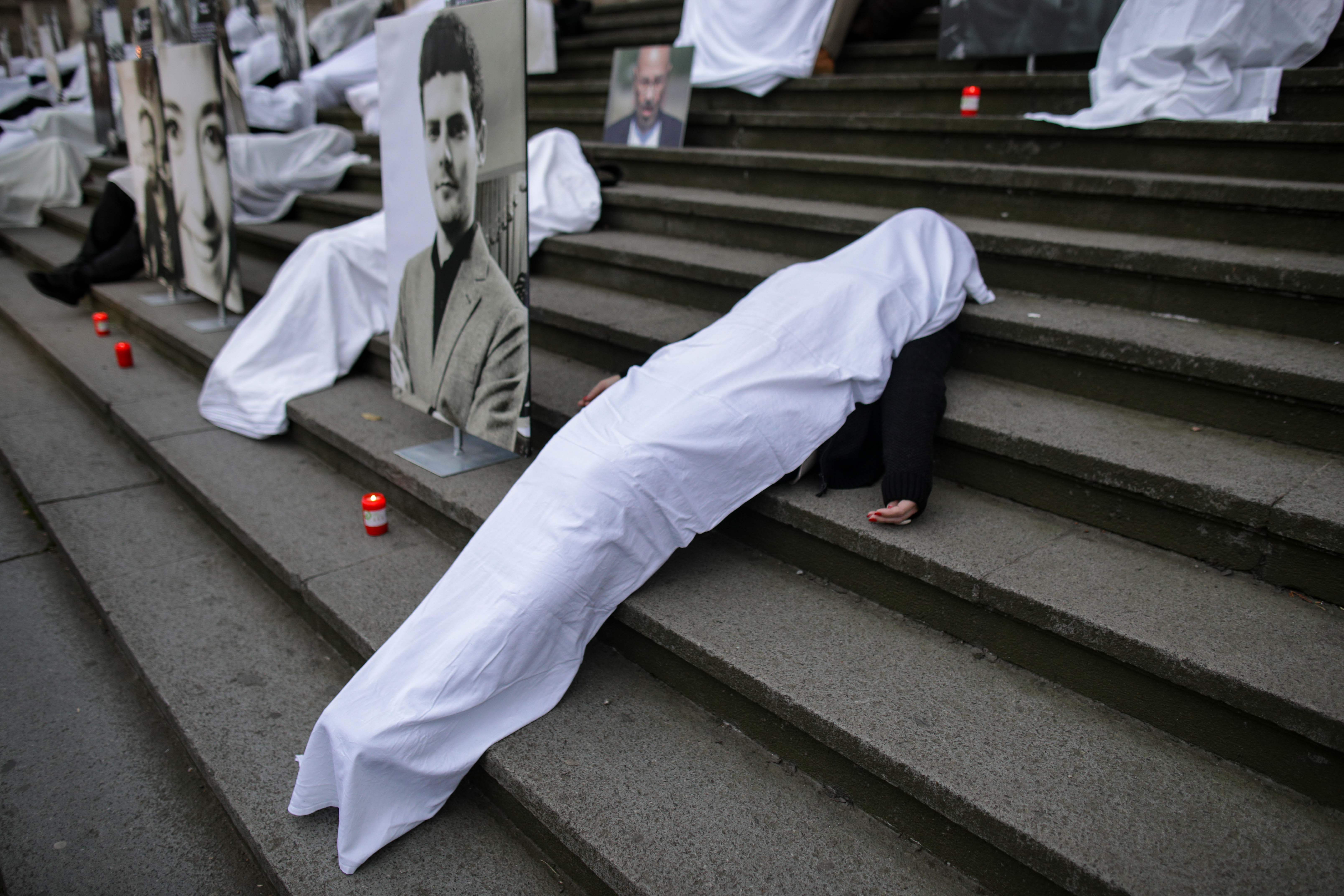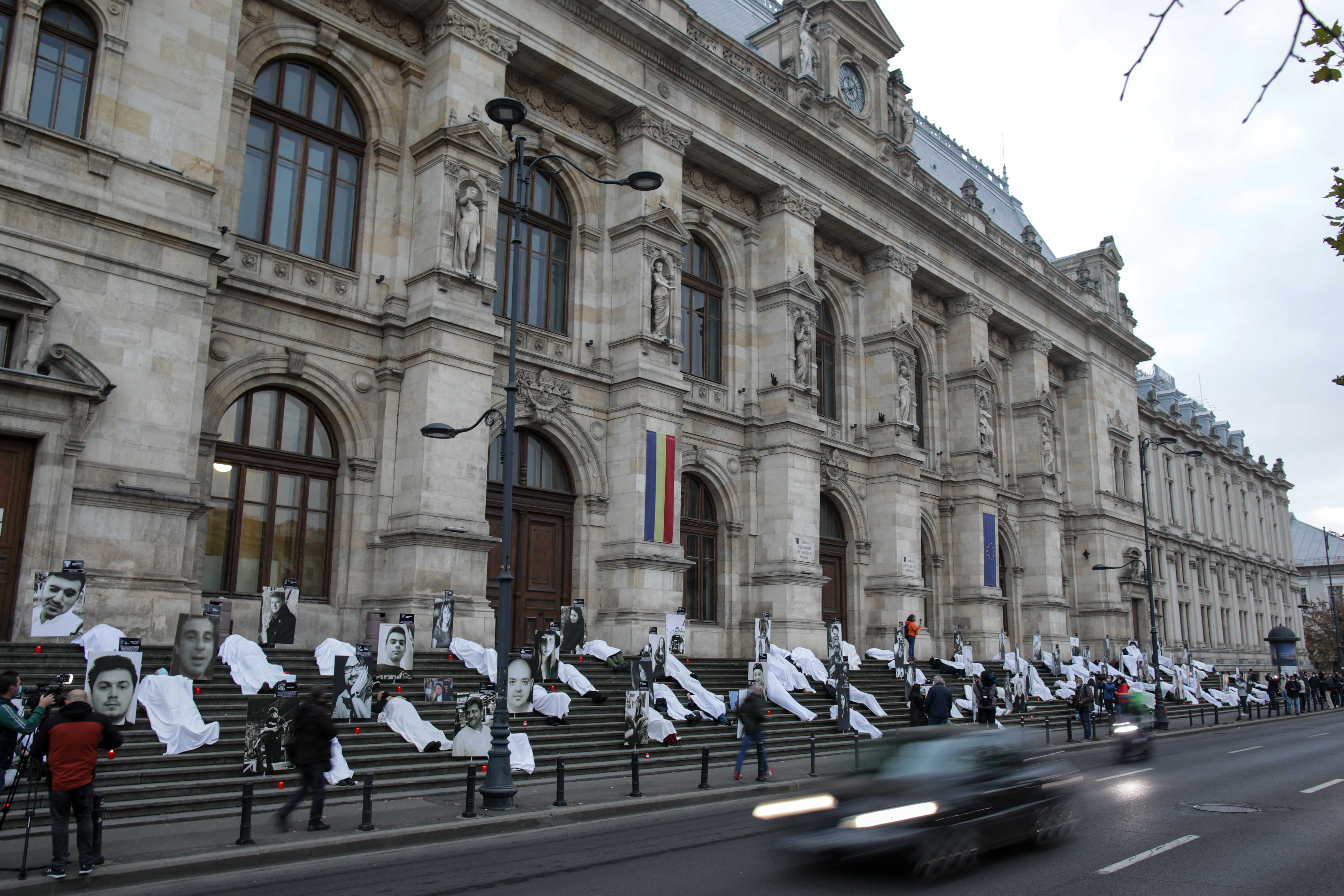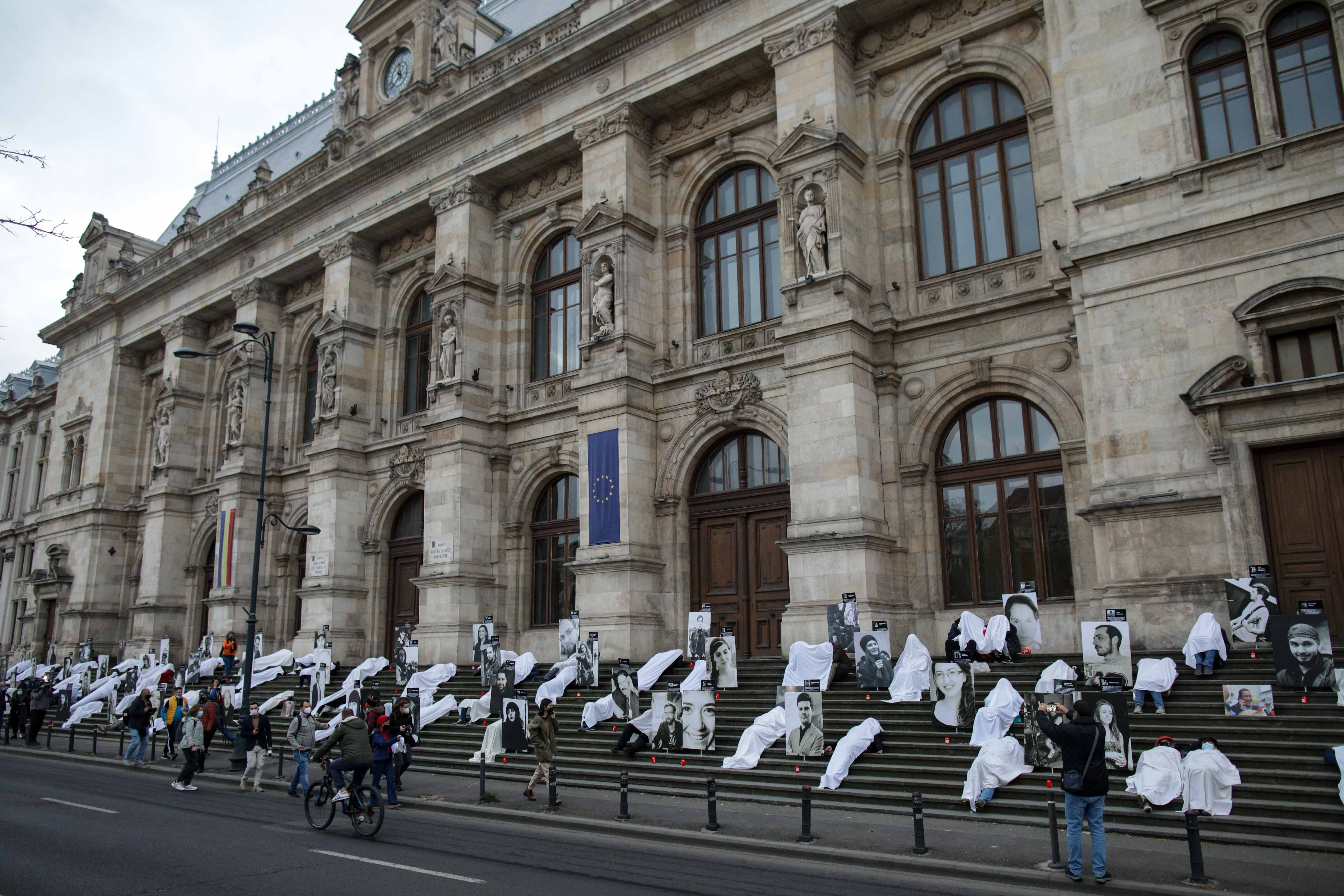 Mai multe persoane acoperite cu pânză albă s-au întins pe treptele Curţii de Apel Bucureşti, unde au fost aprinse lumânări şi au fost aşezate fotografii ale victimelor, conform News.ro.