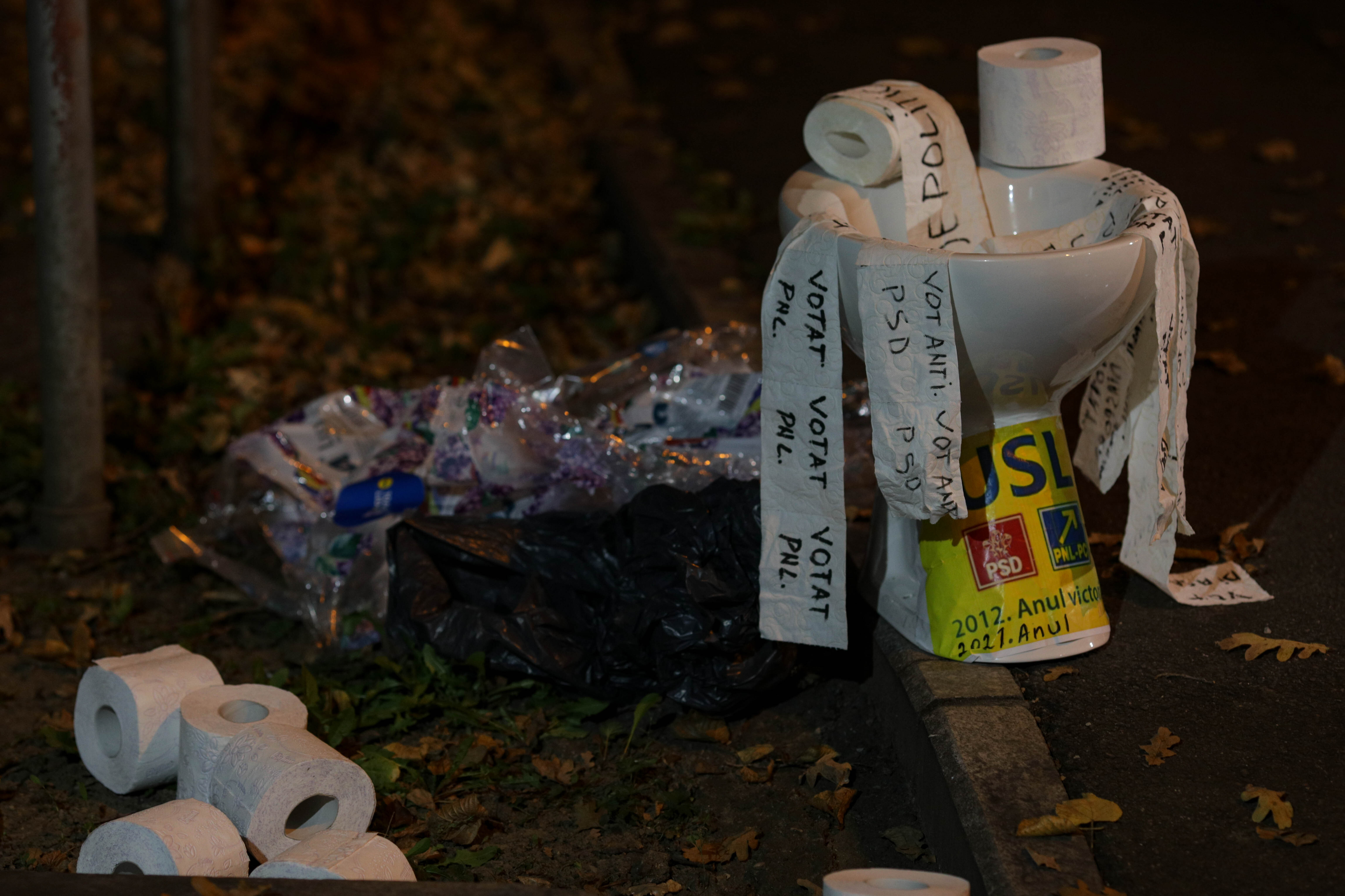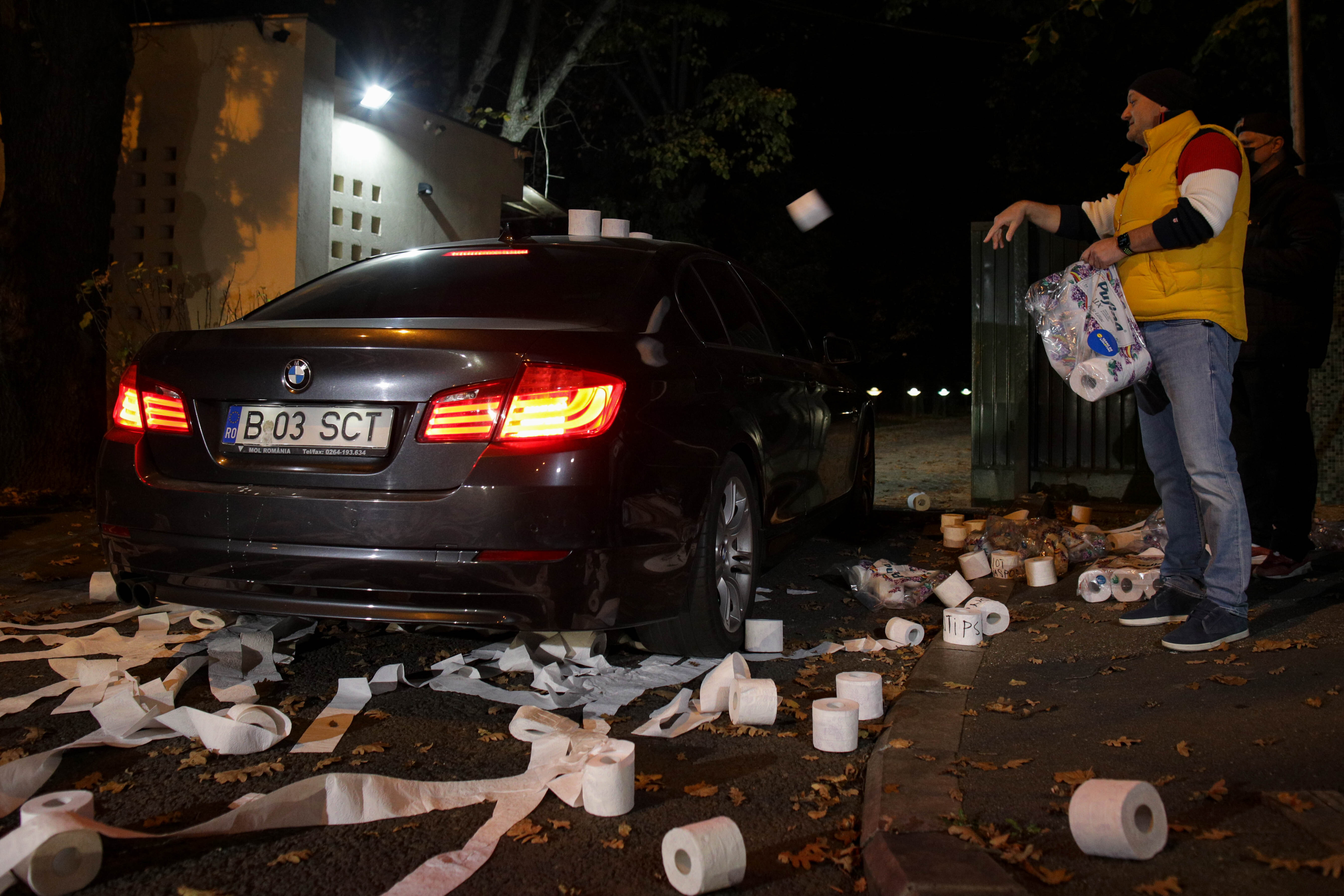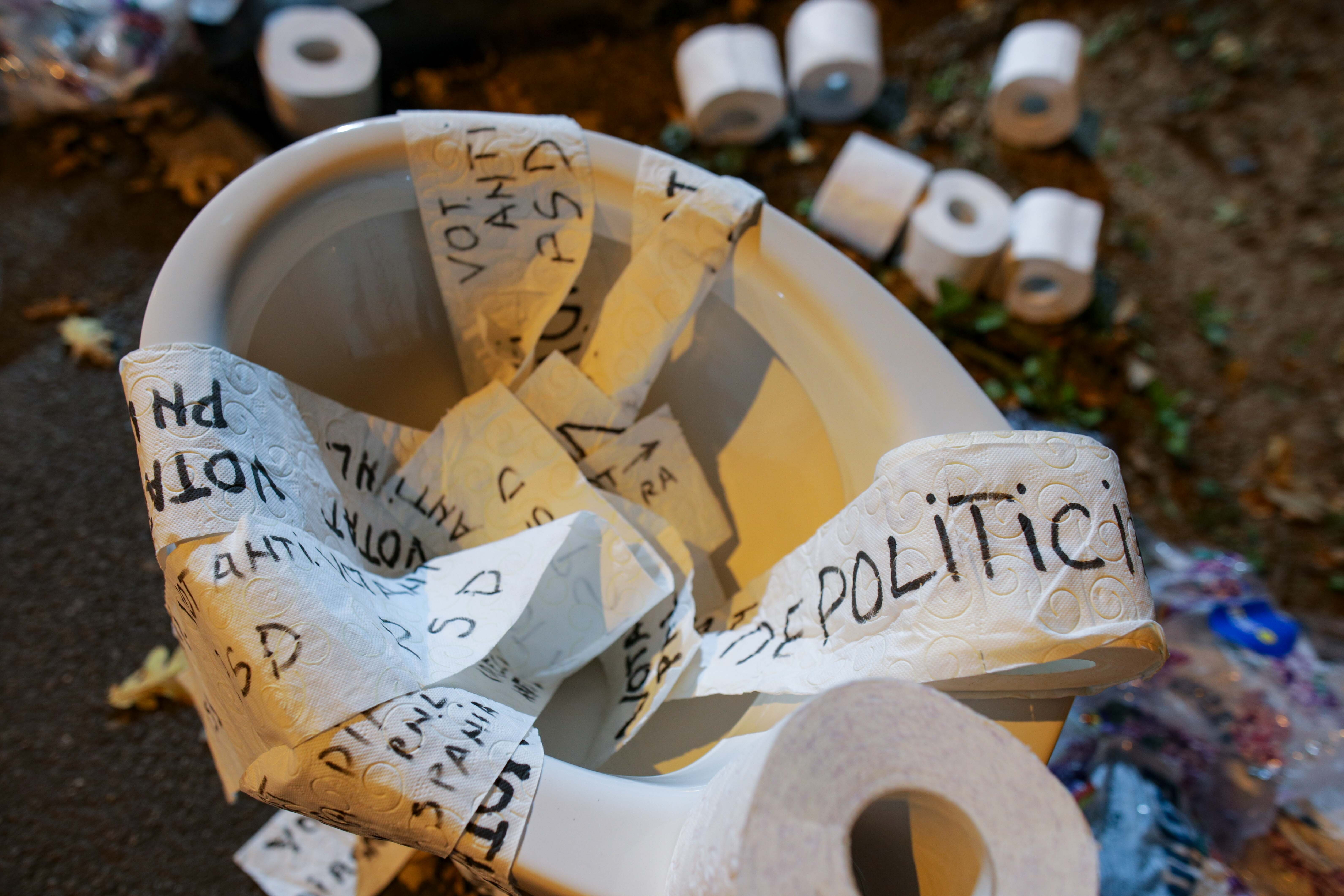 Protest la Vila Lac. Manifestanții au aruncat hârtie igienică înspre mașinile liderilor PNL. GALERIE FOTO și VIDEO