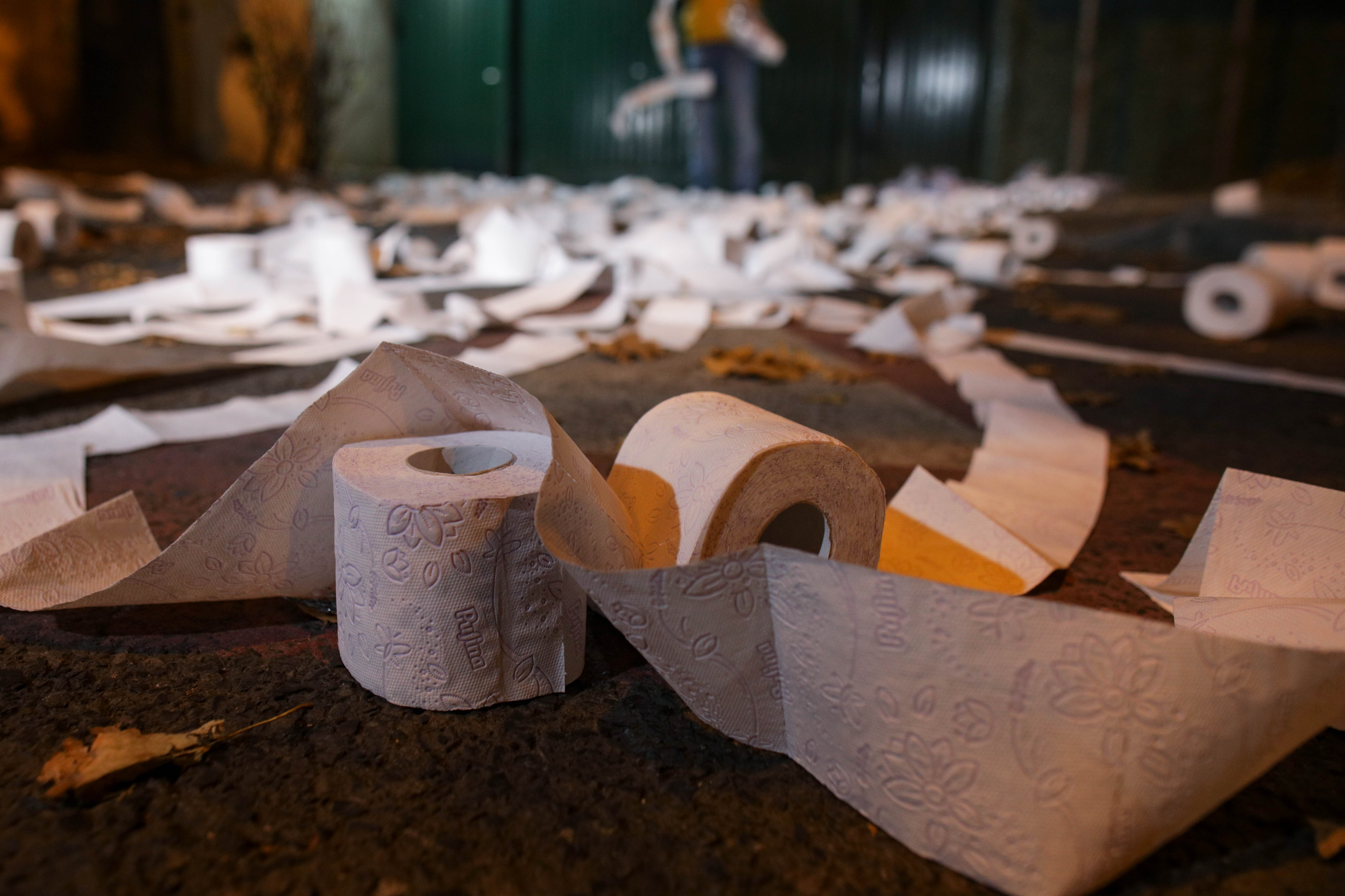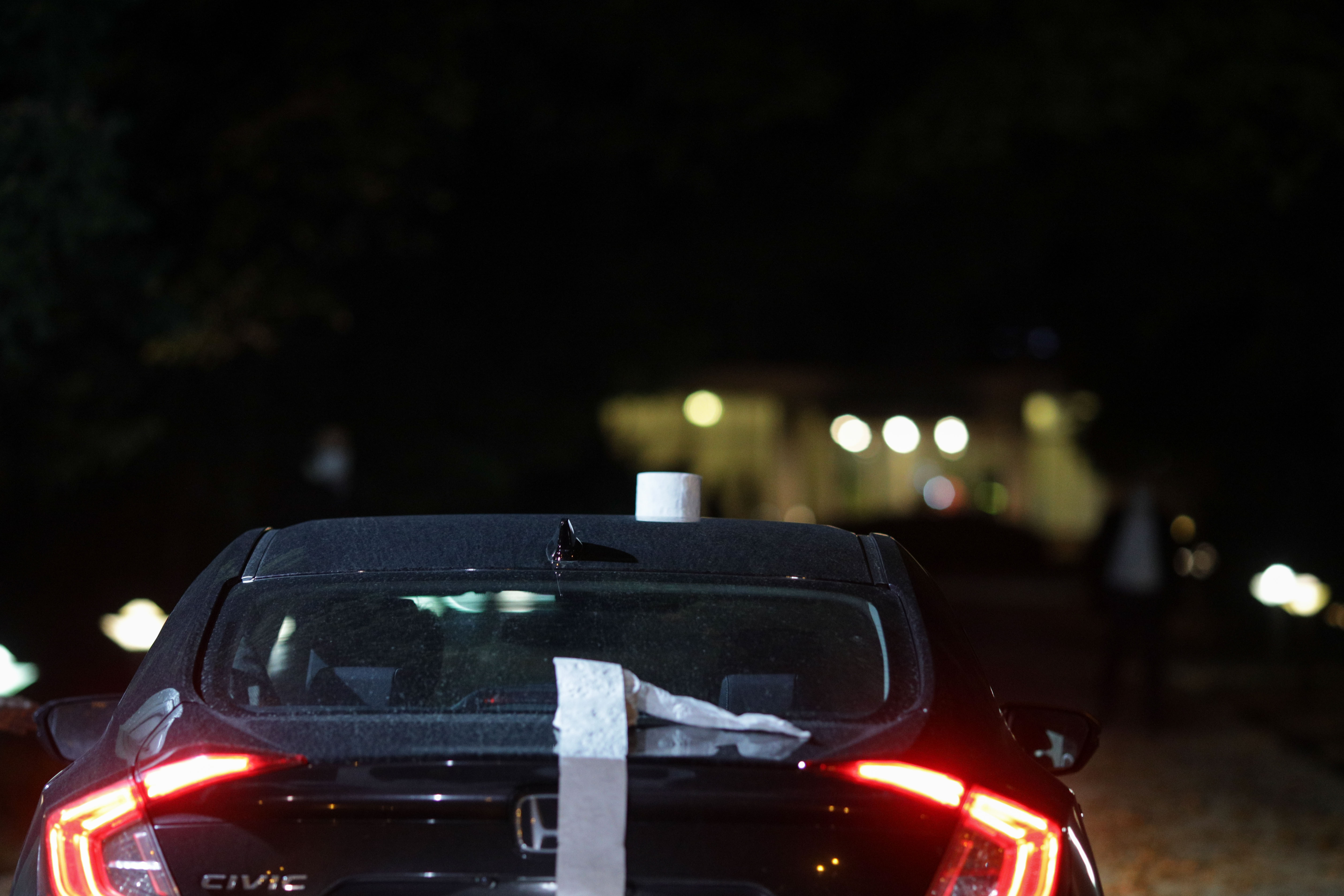 Oamenii aruncă suluri de hârtie igienică înspre mașini, dar le și așază pe acestea când încetinesc.