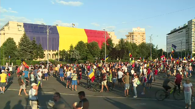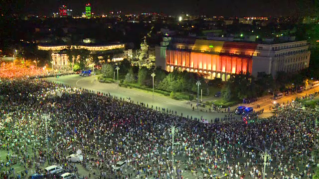 În timp ce oamenii din piaţă au intonat Imnul Naţional, pe faţada Palatului Victoria a fost proiectat un mesaj prin care se cerea demisia Guvernului. Protestatarii scandează „PSD - Ciuma roşie", „Demisia", „Jos Guvernul" şi „România, trezeşte-te".