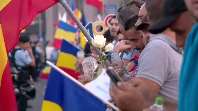 Unii dintre protestatari au venit cu flori, pe care le-au împărţit jandarmilor. Oamenii strigă „Demisia”, „Nu vă fie frică, românii se ridică” şi „Nu cedăm”, suflă în vuvuzele şi flutură steaguri. Unii dintre sunt chiar înfăşuraţi în drapele.
