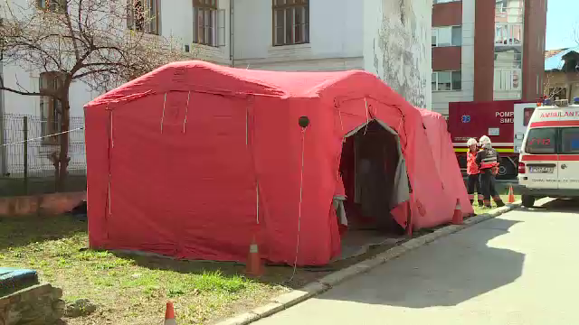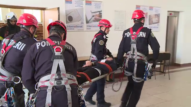 Potrivit scenariului, zece studenţi au rămas blocaţi sub dărâmături în acest amfiteatru. Doi dintre ei sunt inconştienţi şi sunt preluaţi pe targă de către pompieri.