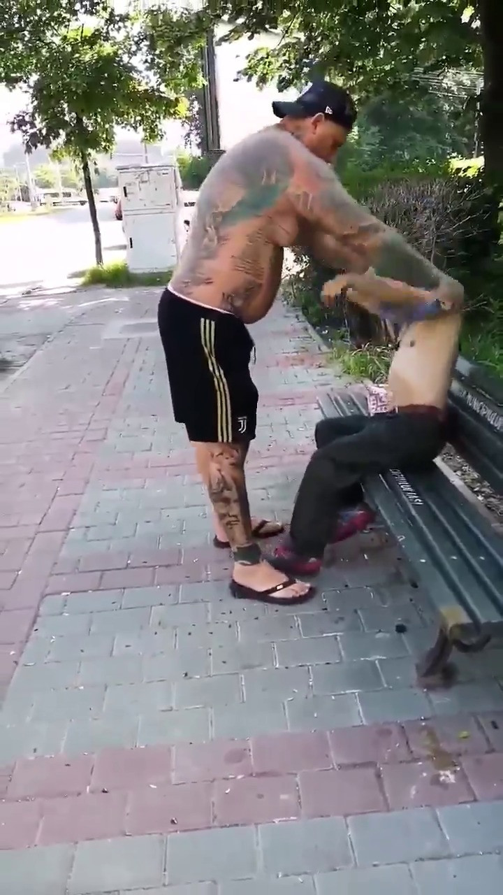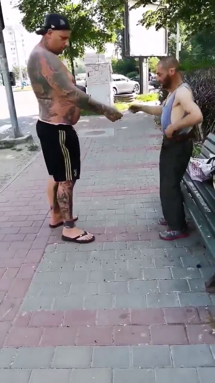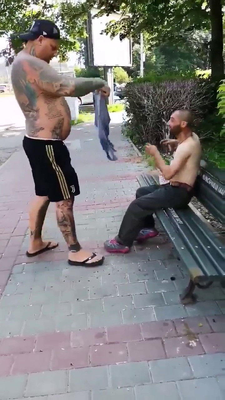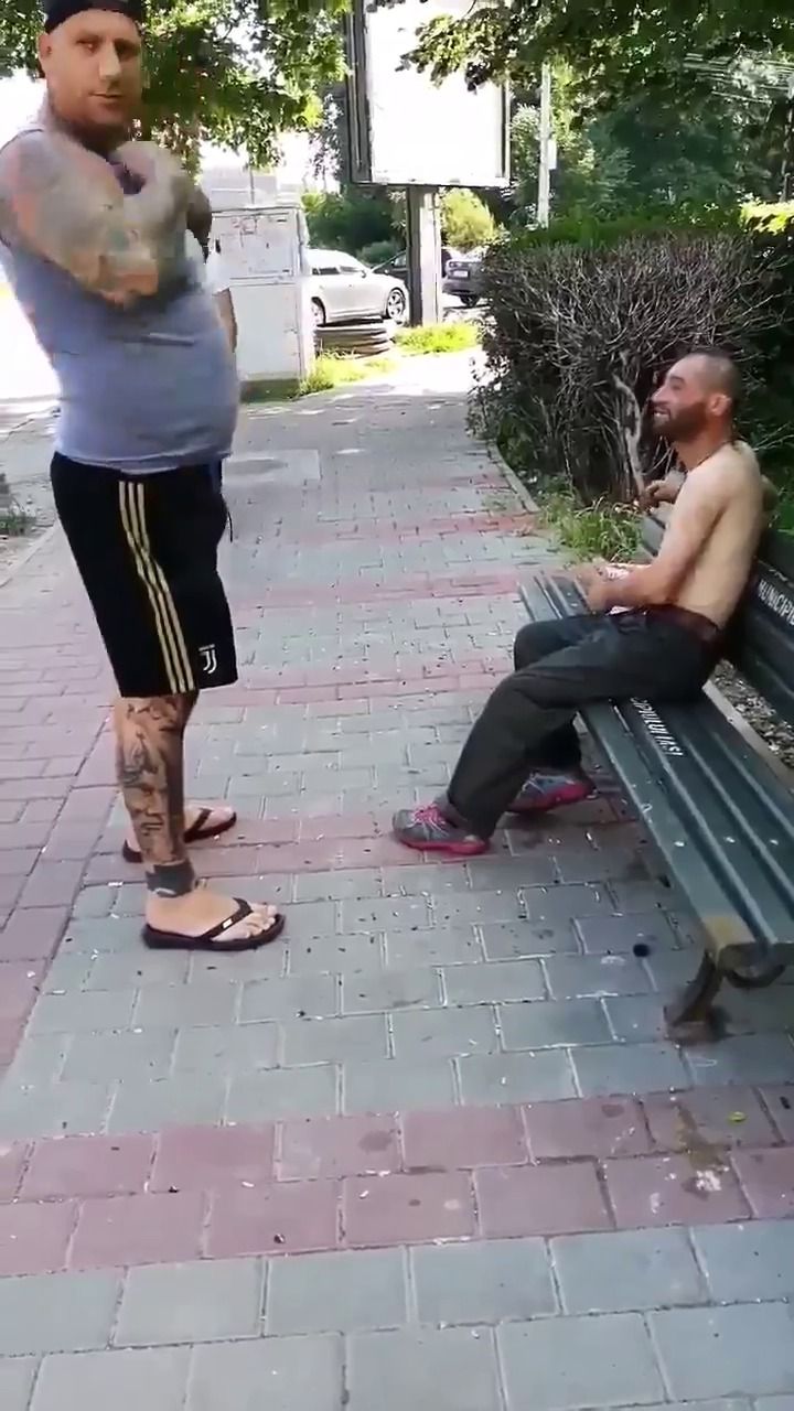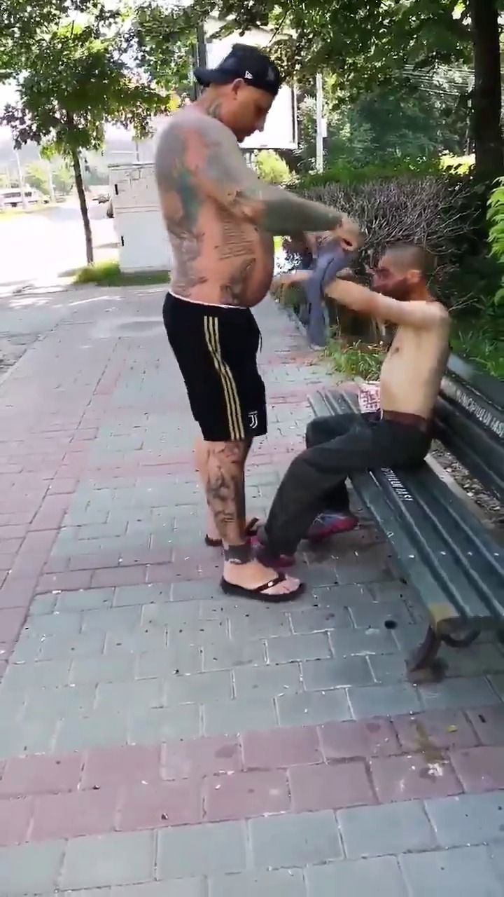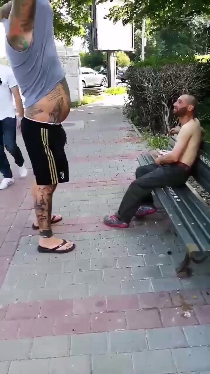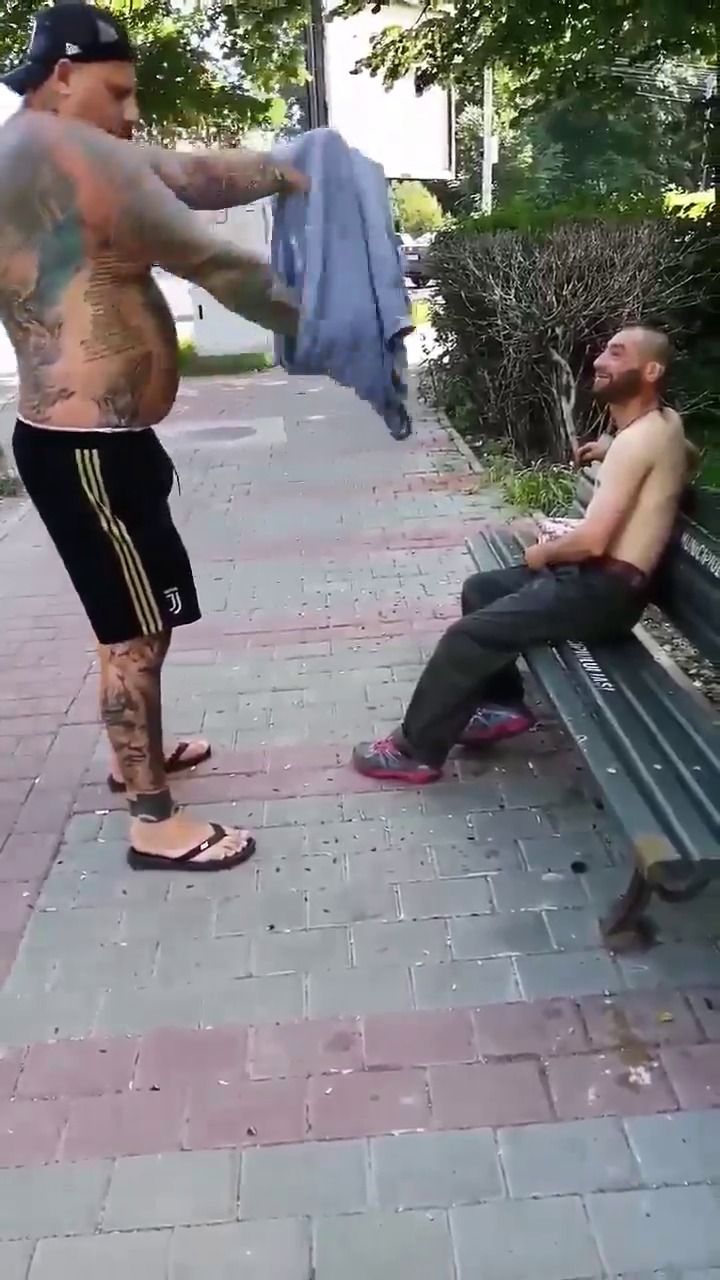 Imagini filmate în Iași, cu un tânăr tatuat și un cerșetor la bustul gol, pe o bancă, au devenit virale după ce au fost publicate sâmbătă pe un cont de Facebook.