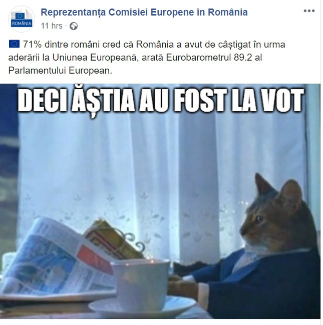 "71% dintre români cred că România a avut de câștigat în urma aderării la Uniunea Europeană, arată Eurobarometrul 89.2 al Parlamentului European. Deci ăștia au fost la vot", este mesajul publicat de Reprezentanța Comisiei Europee din România.