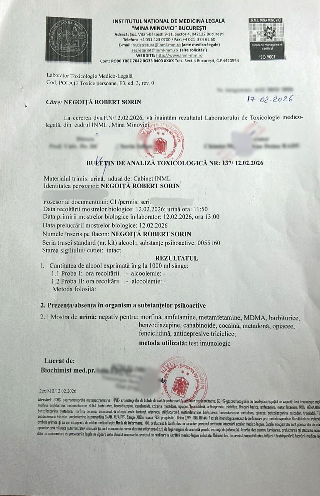 Rezultatul testului antidrog făcut de Robert Negoiță la Institutul Național de Medicină Legală. DOCUMENT