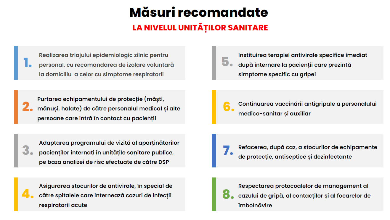 ”În funcţie de situaţia de joi se va declara epidemia de gripă. Nu se introduc restricţii, se iau măsuri în spitale pentru limitarea vizitelor pentru perioada cât va evolua starea de epidemie. Se vor intensifica măsurile pentru protecţia personalului medical şi a pacienţilor, inclusiv masca în interior, screening epidemiologic. Orice persoană care e răcită trebuie să evite se revină în colectivitate până la dispariţia simptomelor. Cel mai important e să fii izolat, să nu transmiţi mai departe infecţia respiratorie. Colegii mei au recomandat ca antibioticele să nu fie utilizate în infecţiile virale, iar pacienţii să se prezinte la unităţile de primiri urgenţe în cazurile medii şi grave. Cei cu forme uşoare trebuie să se adreseze medicilor de familie, să nu aglomereze camerele de urgenţe”, a declarat Alexandru Rafila.
