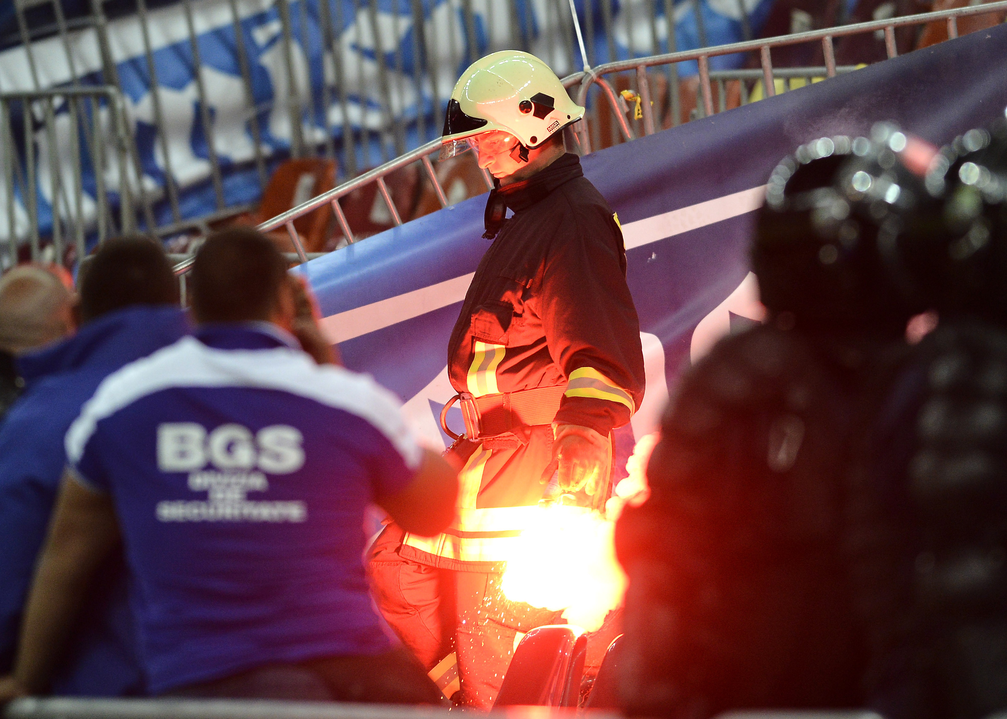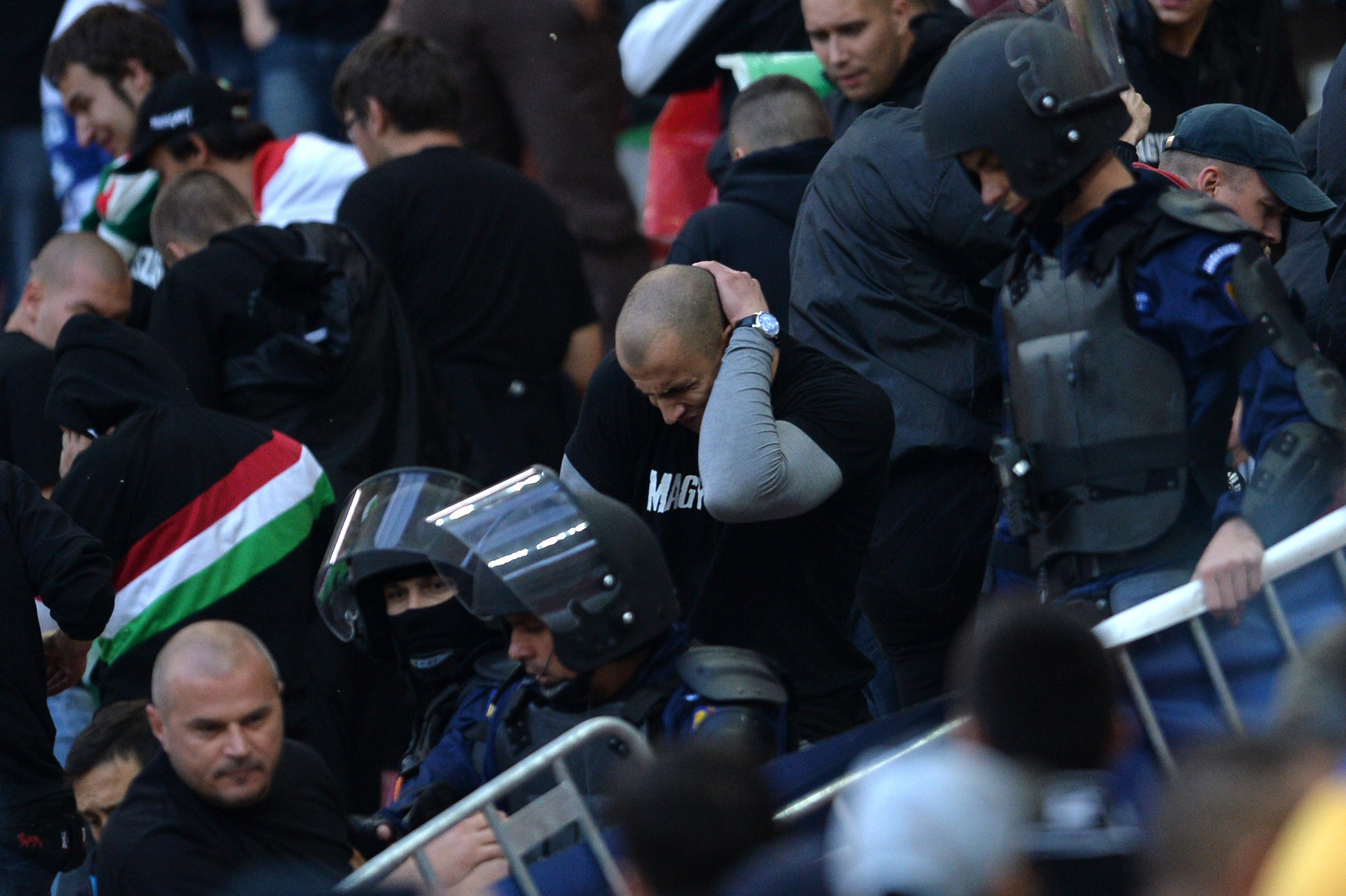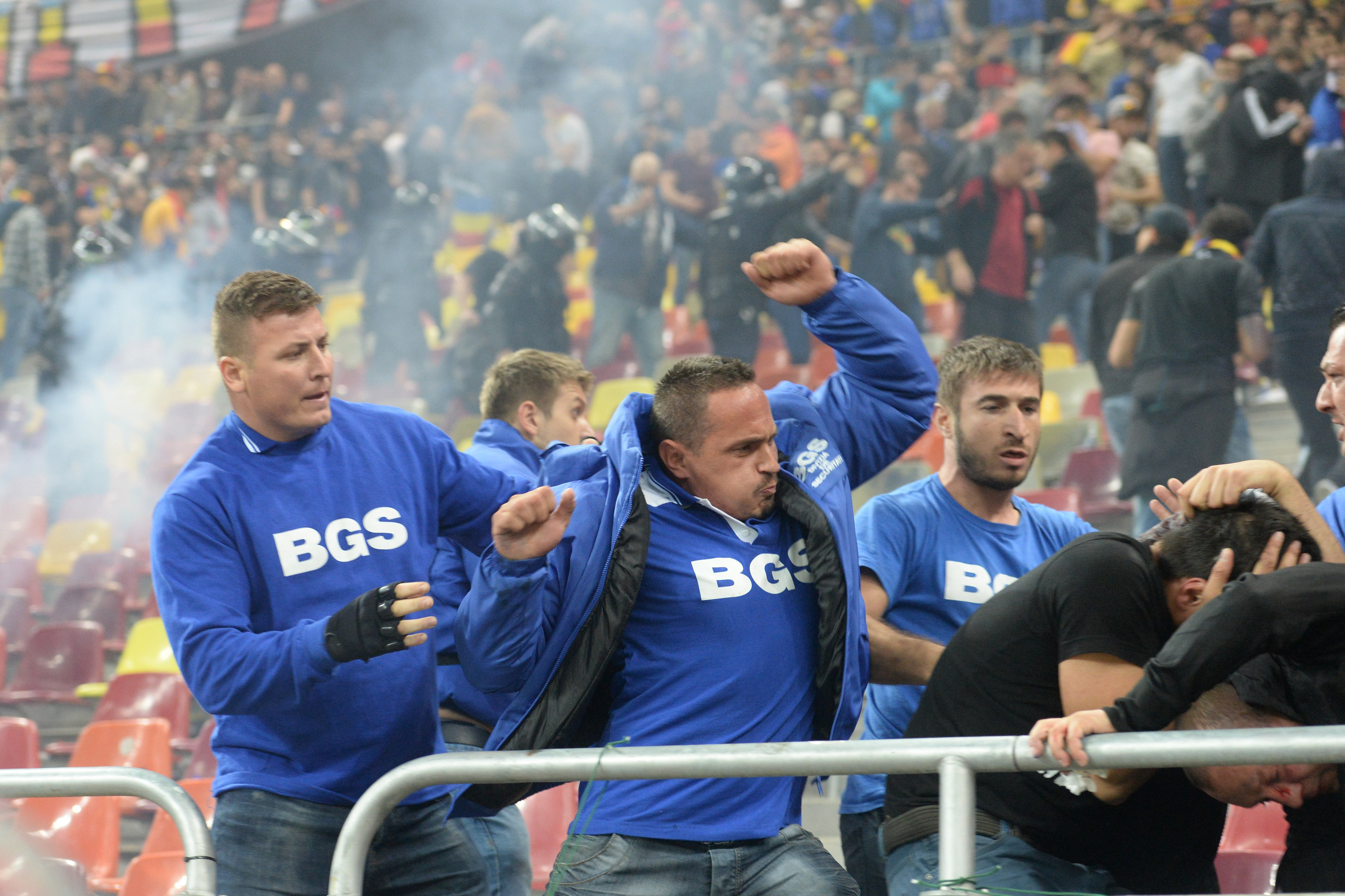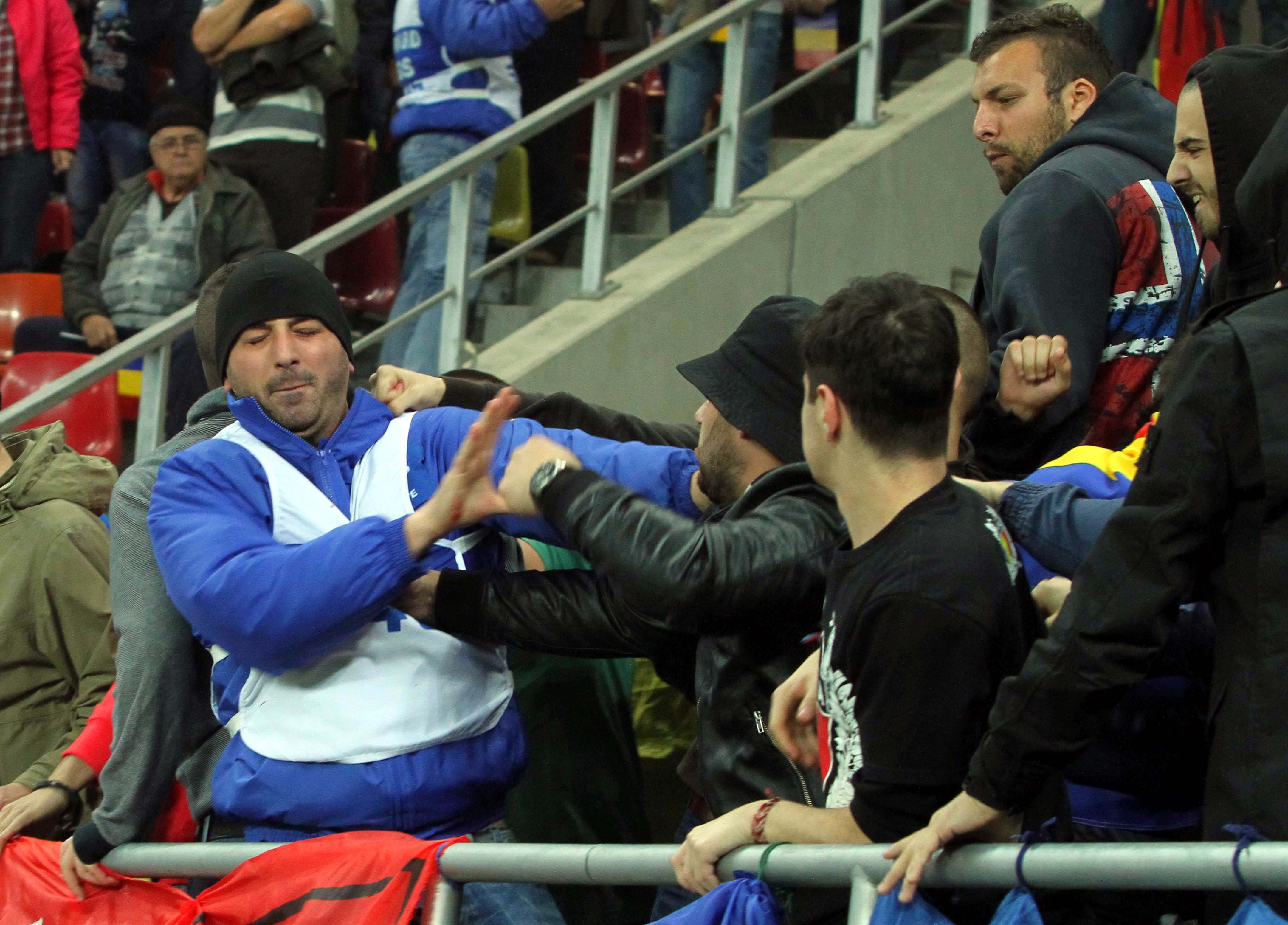 Luptele din tribune au inceput inainte ca jucatorii sa loveasca in minge. Chiar in timpul intonarii imnurilor, unii suporteri romani si maghiari au inceput sa se provoace si sa arunce unii spre ceilalti cu torte si petarde. Furiosi, o parte dintre maghiari au inceput sa rupa gardurile de protectie.